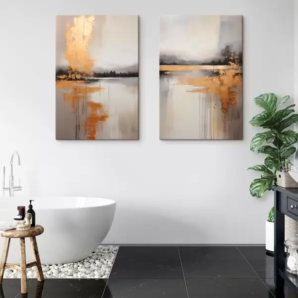Maalid Abstraktne maastik järve, puu ja kollase uduga , vesi peegeldab ja pilvine taevas Nr m00657
