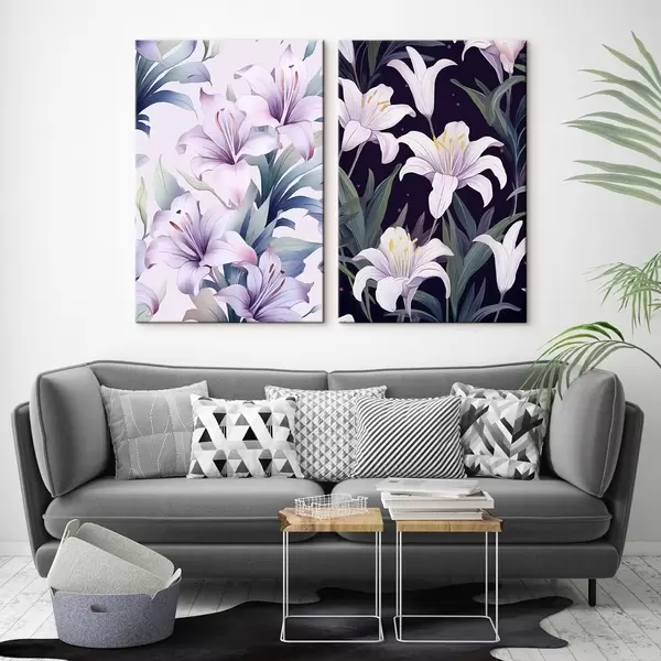 Maalid Õrnad roosad liiliad roheliste lehtedega heledal ja tumedal taustal Nr m00689