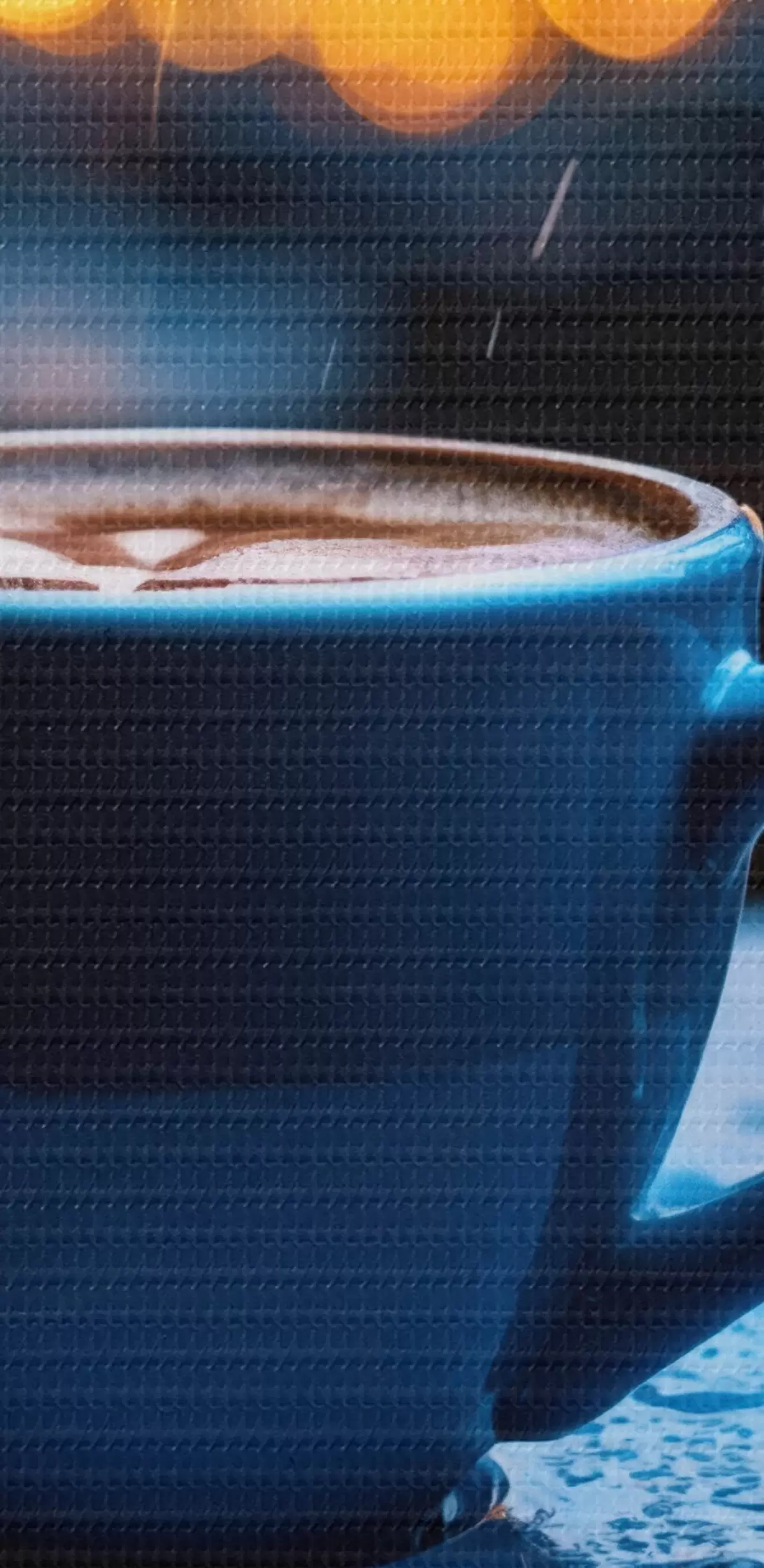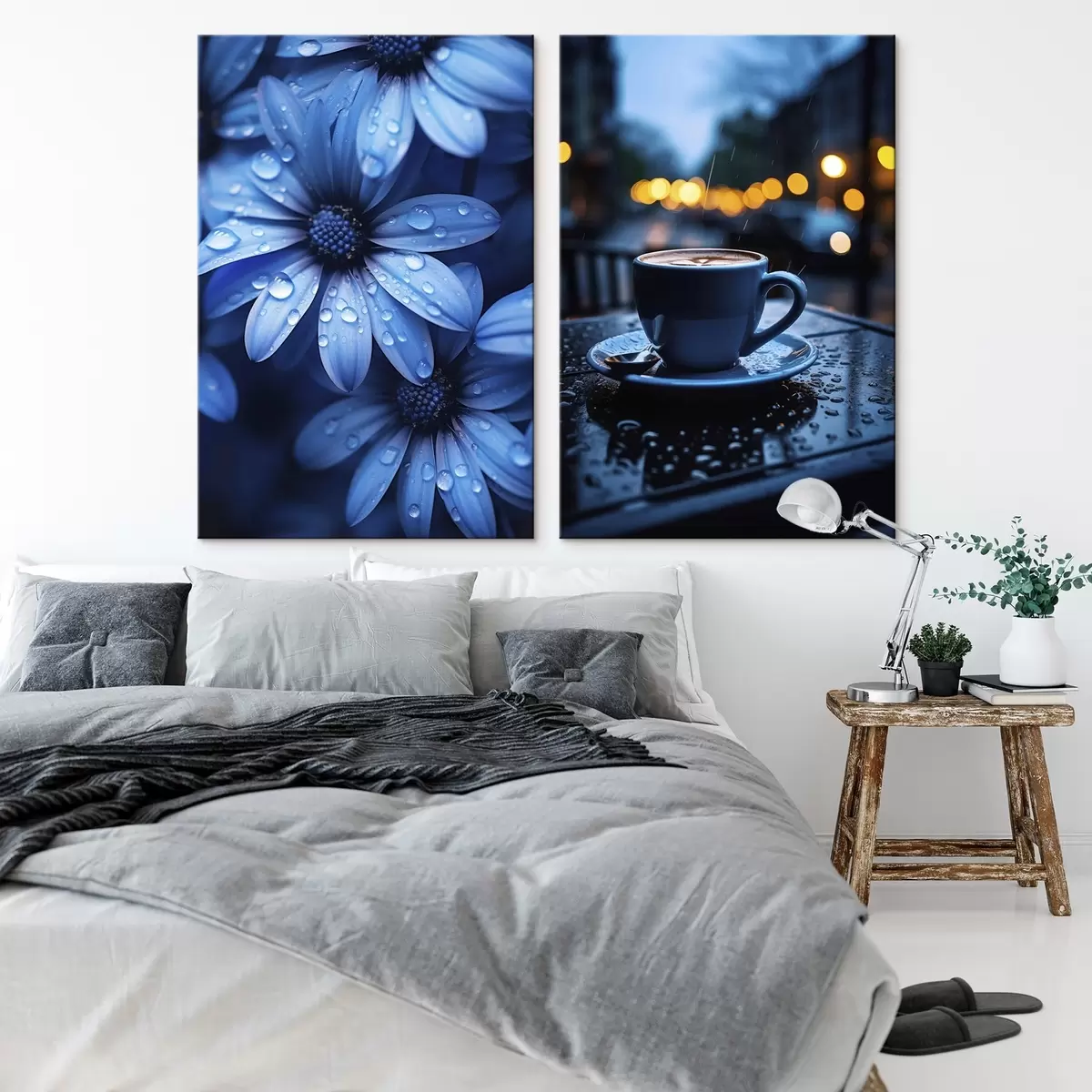 Maalid Sinised lilled koos veetilkadega ja tass kohvi vihma käes Nr m00694