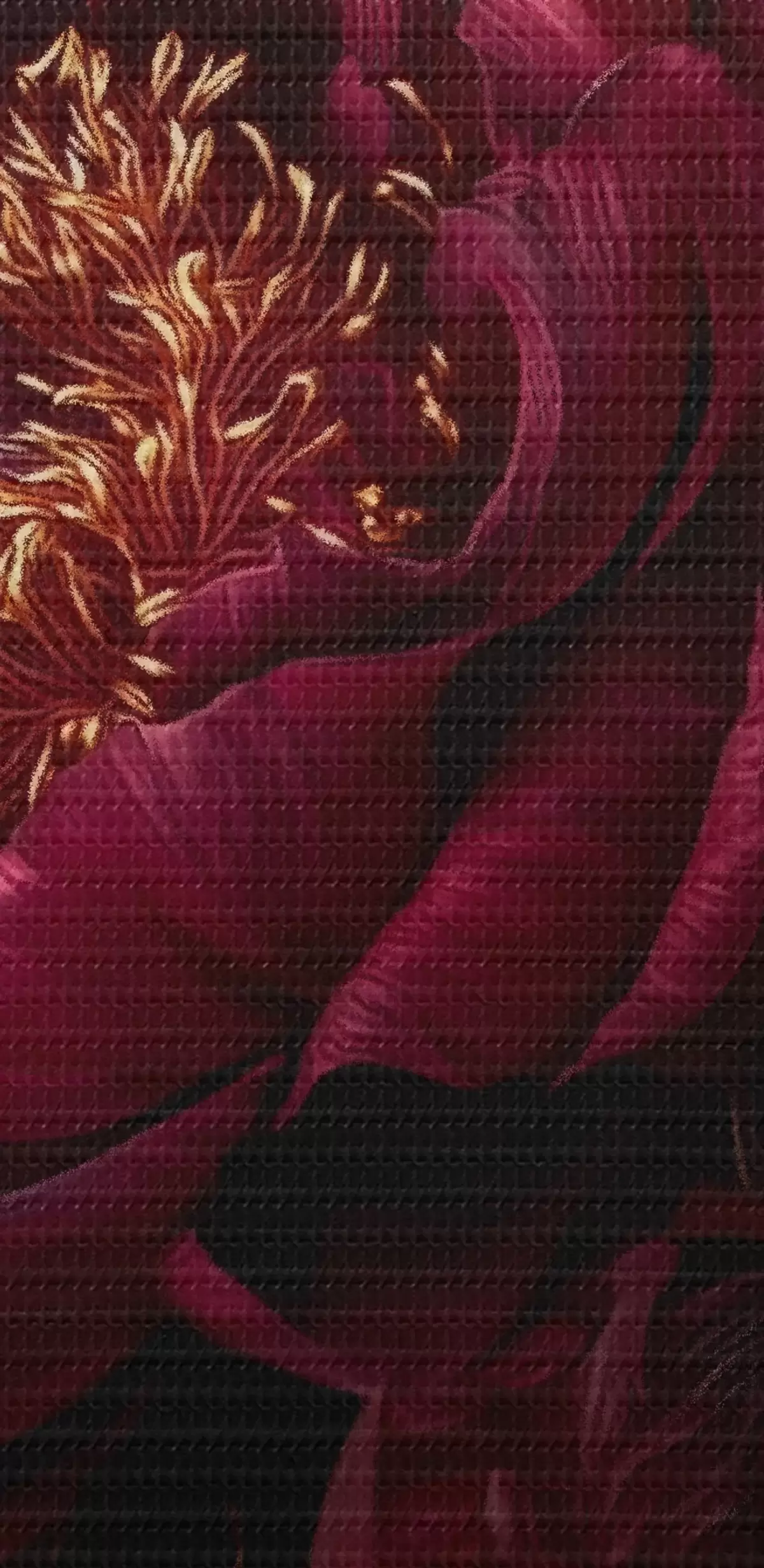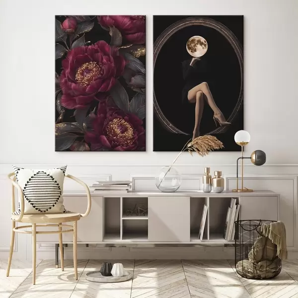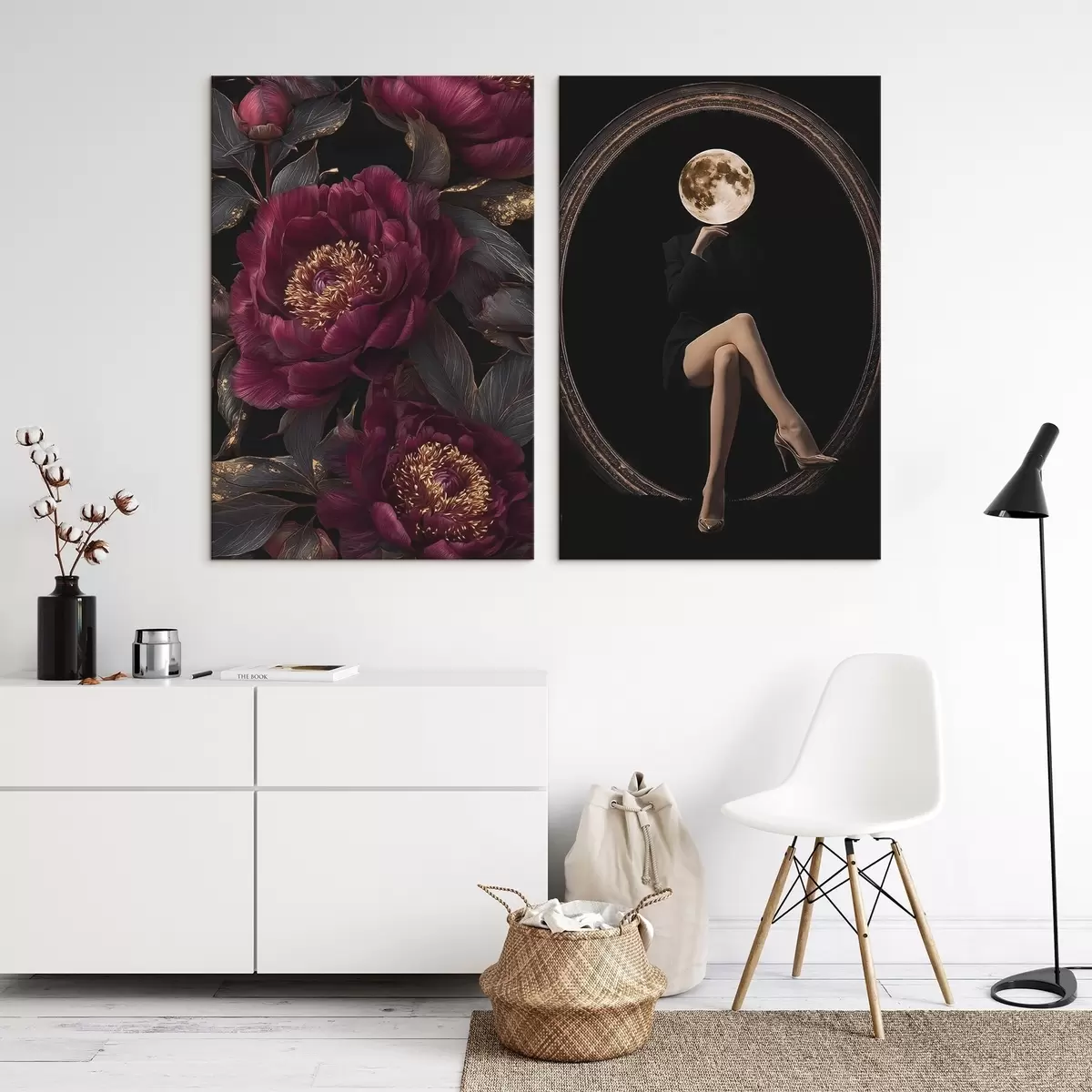 Maalid Burgundia peonid ja kuu peaga siluett mustal taustal Nr m00765