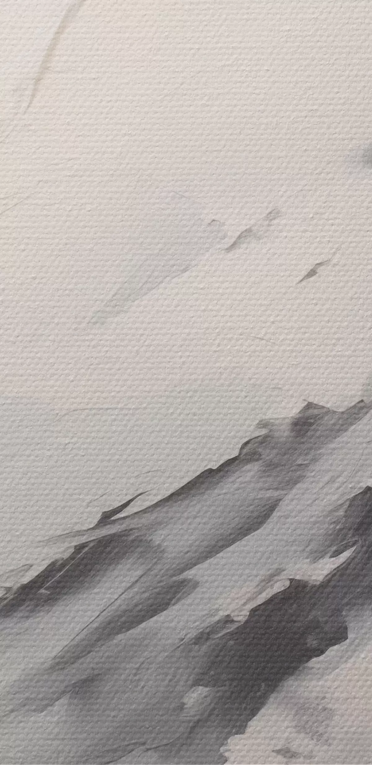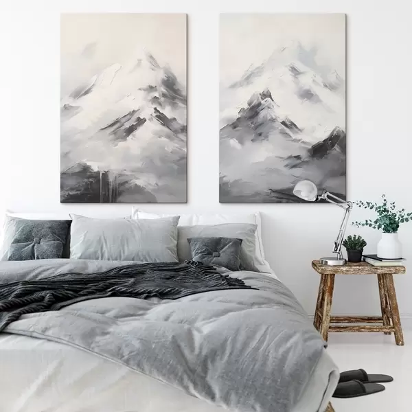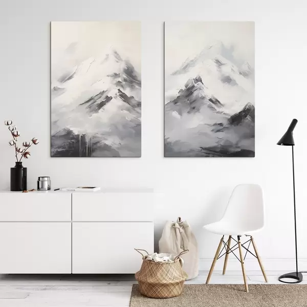 Maalid Lumised mäetipud hallide varjudega, hall taevas, pintslitõmbed, tekstuurne, minimalistlik Nr m00822