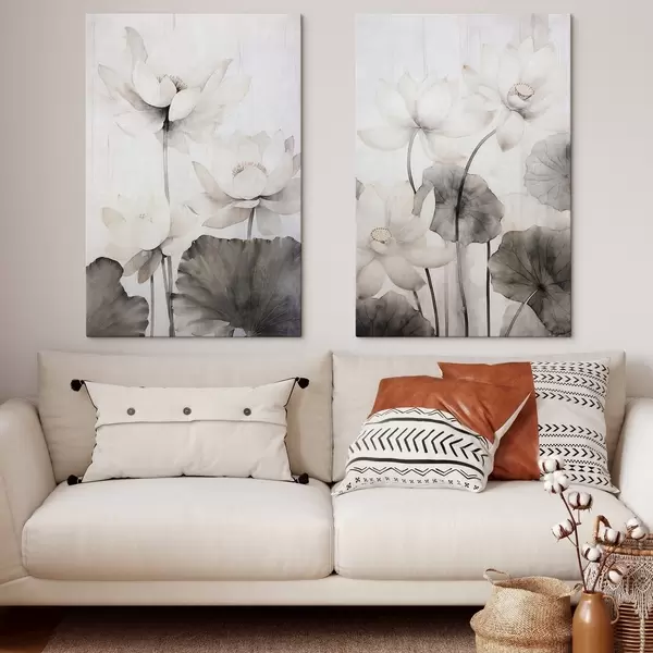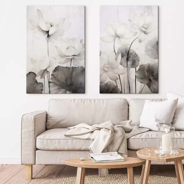 Maalid Valged tekstuuriga lootoseõied tumedate lehtedega, hele taust, minimalistlik disain Nr m00824