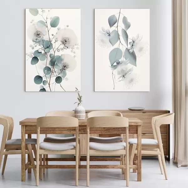 Maalid Eukalüptuse oks siniste lehtede ja valget värvi õitega, hele taust Nr m00829