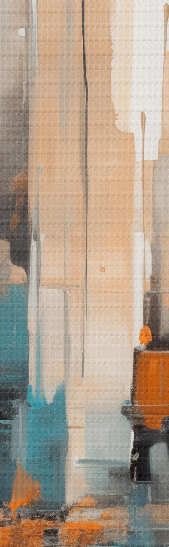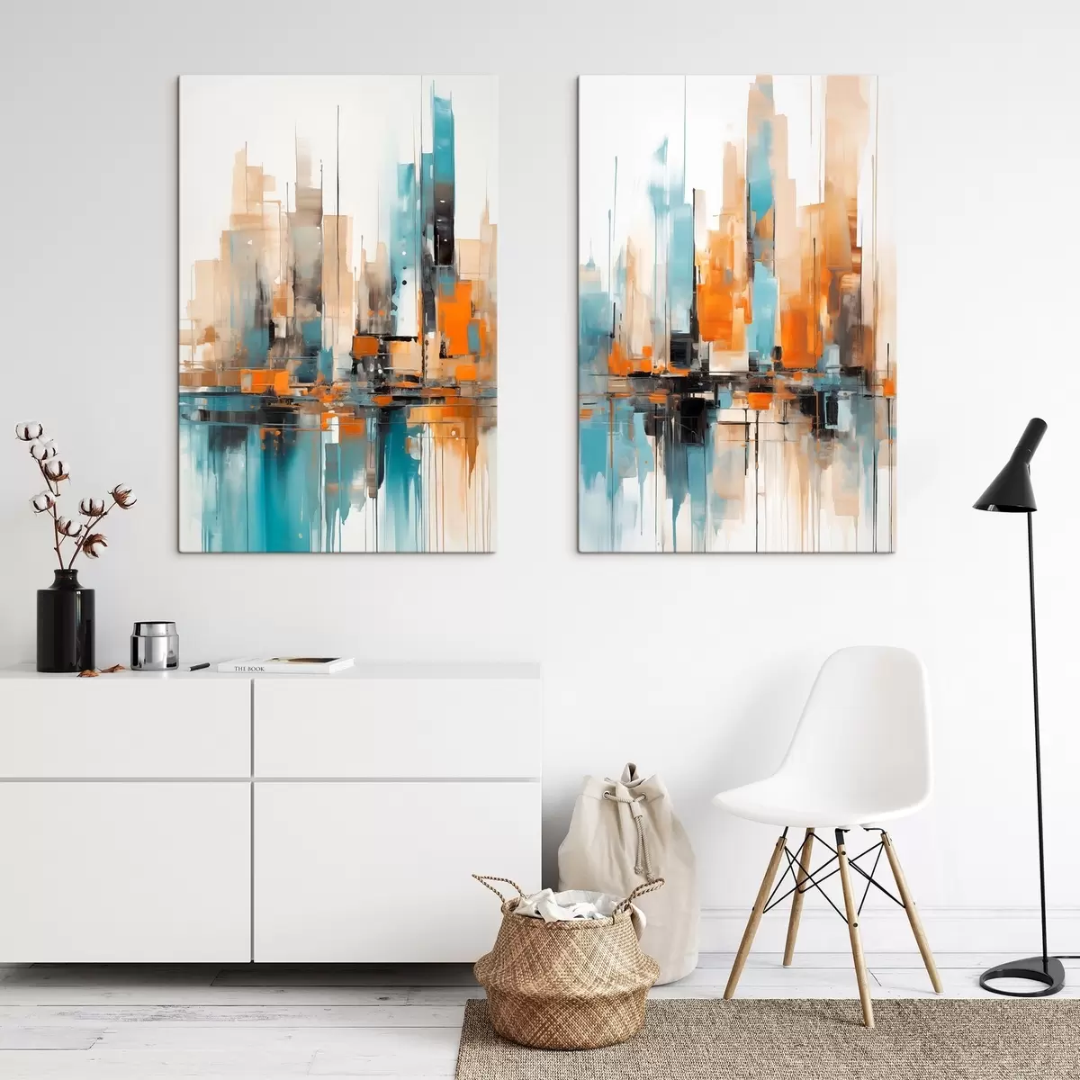 Maalid Abstraktne linnamaastik oranži, sinise ja valge toonides vertikaalsete pintslitõmmetega, maalistiil Nr m00876