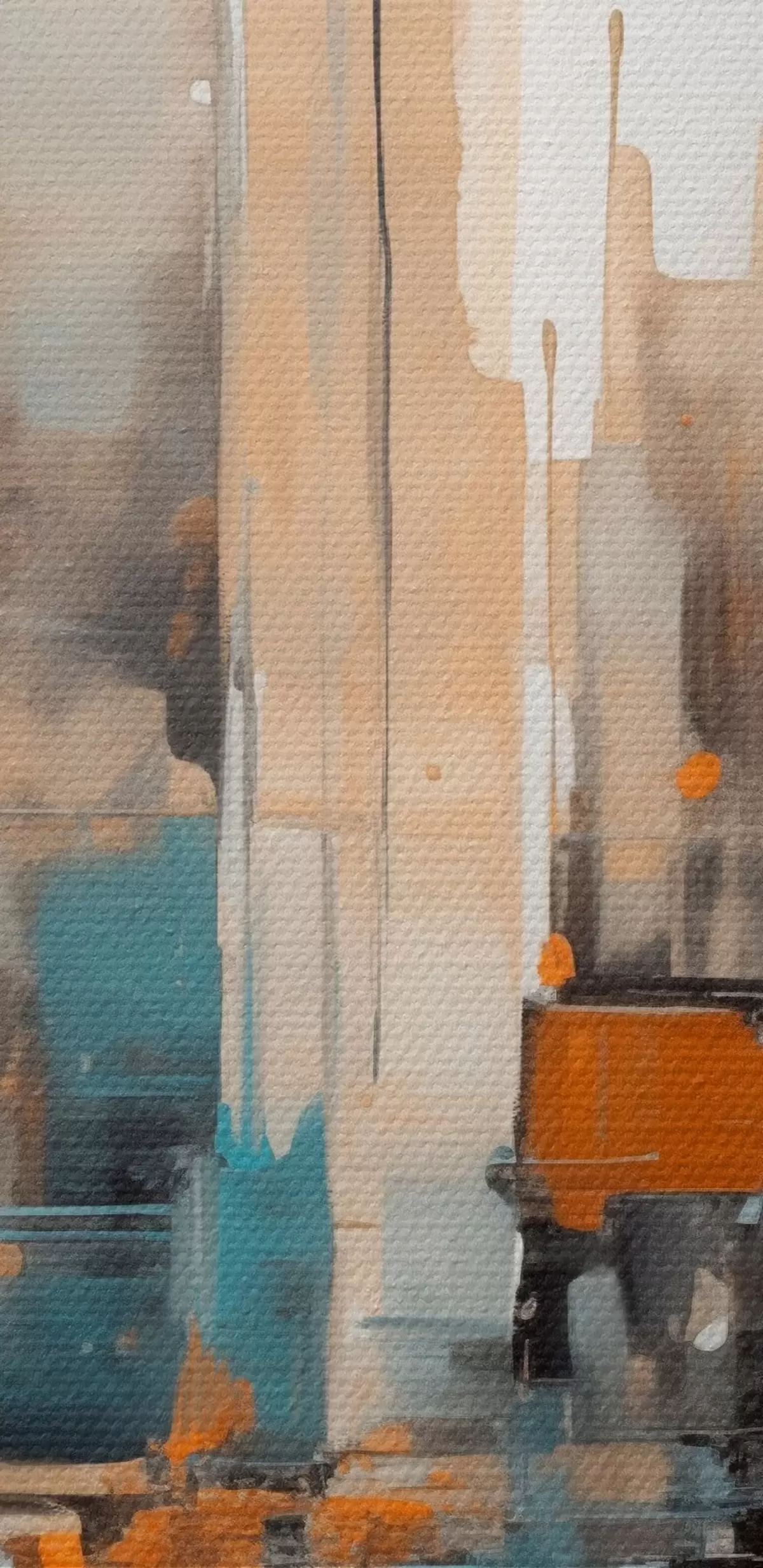 Maalid Abstraktne linnamaastik oranži, sinise ja valge toonides vertikaalsete pintslitõmmetega, maalistiil Nr m00876