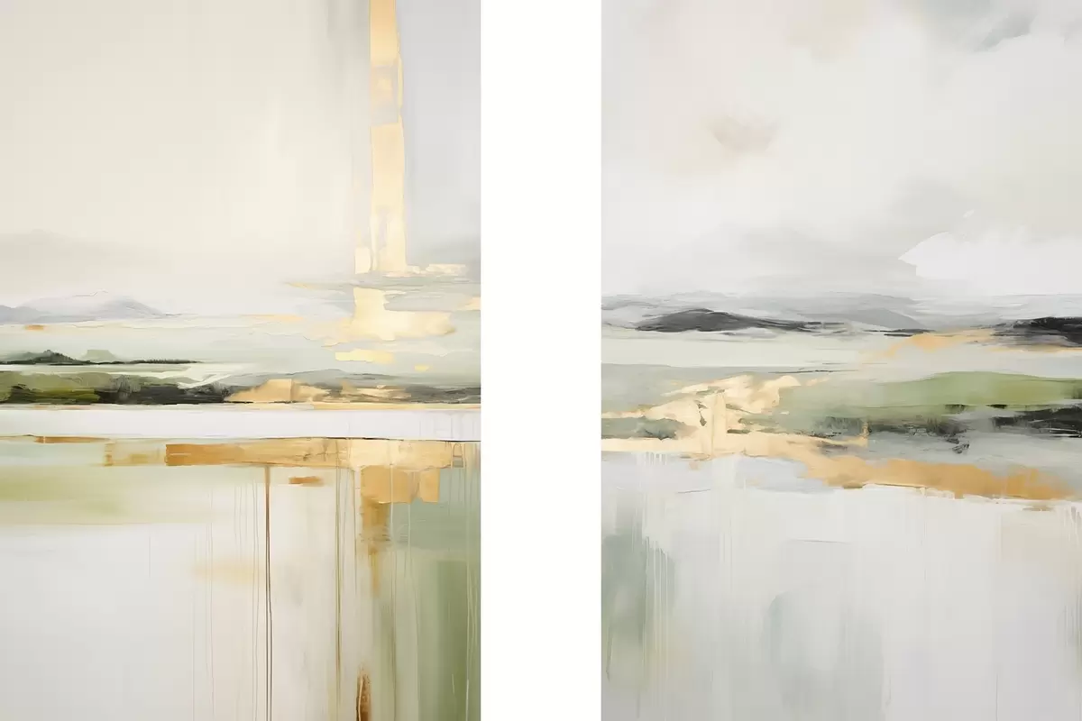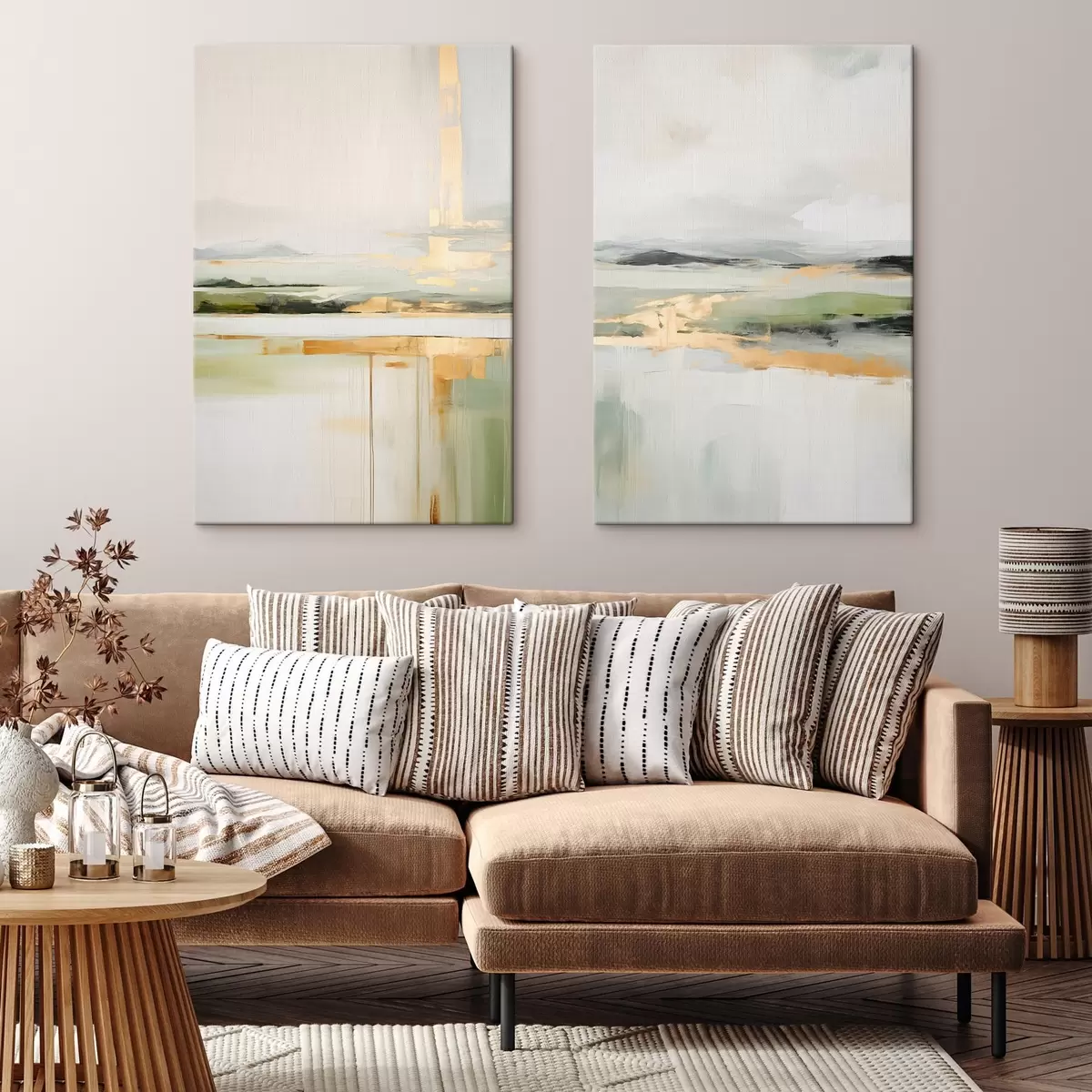 Maalid Abstraktne maastik kollaste aktsentidega, minimalistlik kompositsioon maast, veest ja taevast, vaoshoitud värvidega Nr m00877