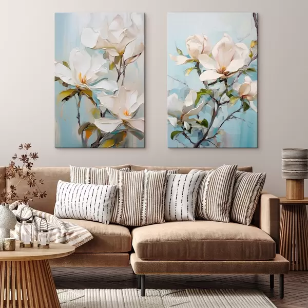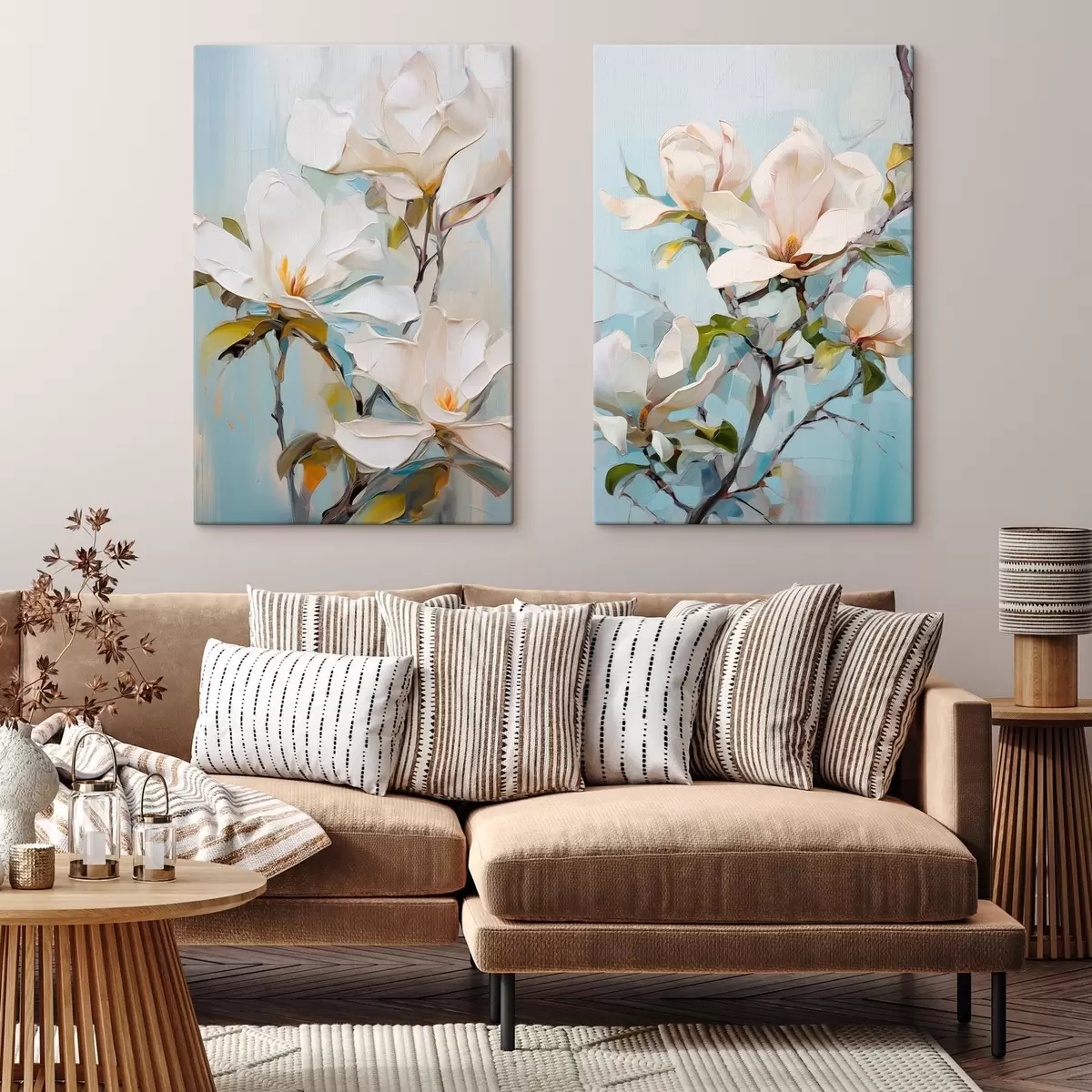 Maalid Valged magnoliaõied, helesinine taust pehme pintslitõmbega, õlimaalistiilis, impasto tekstuuriga Nr m00881