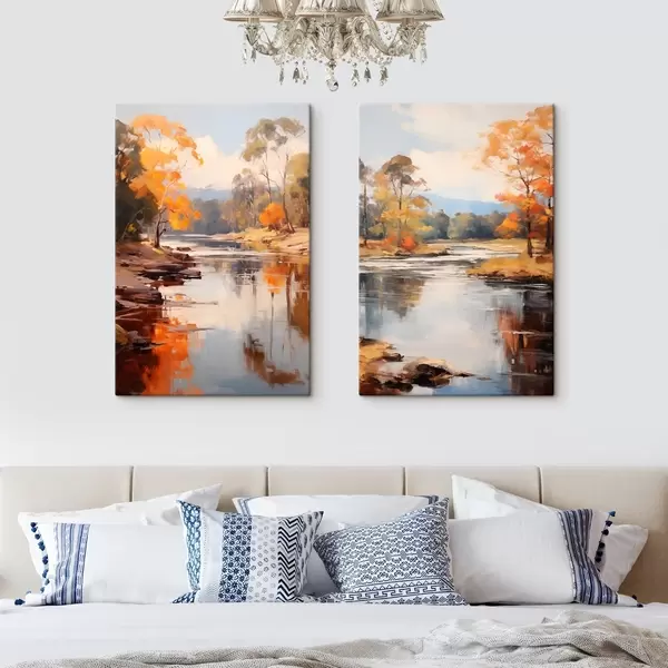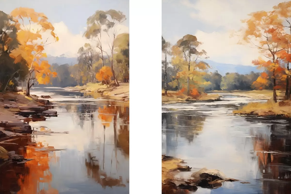 Maalid Sügisene maastik, jõgi puudega kaldal, mets taustal, peegeldused veepinnal Nr m00883