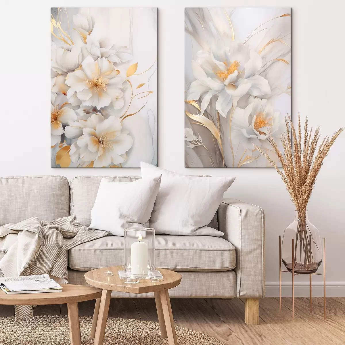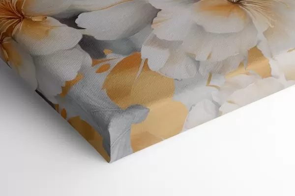 Maalid Valged lilled kollaste detailidega, õielehed peene varjundiga, hele taust peene marmoriefektiga Nr m00889