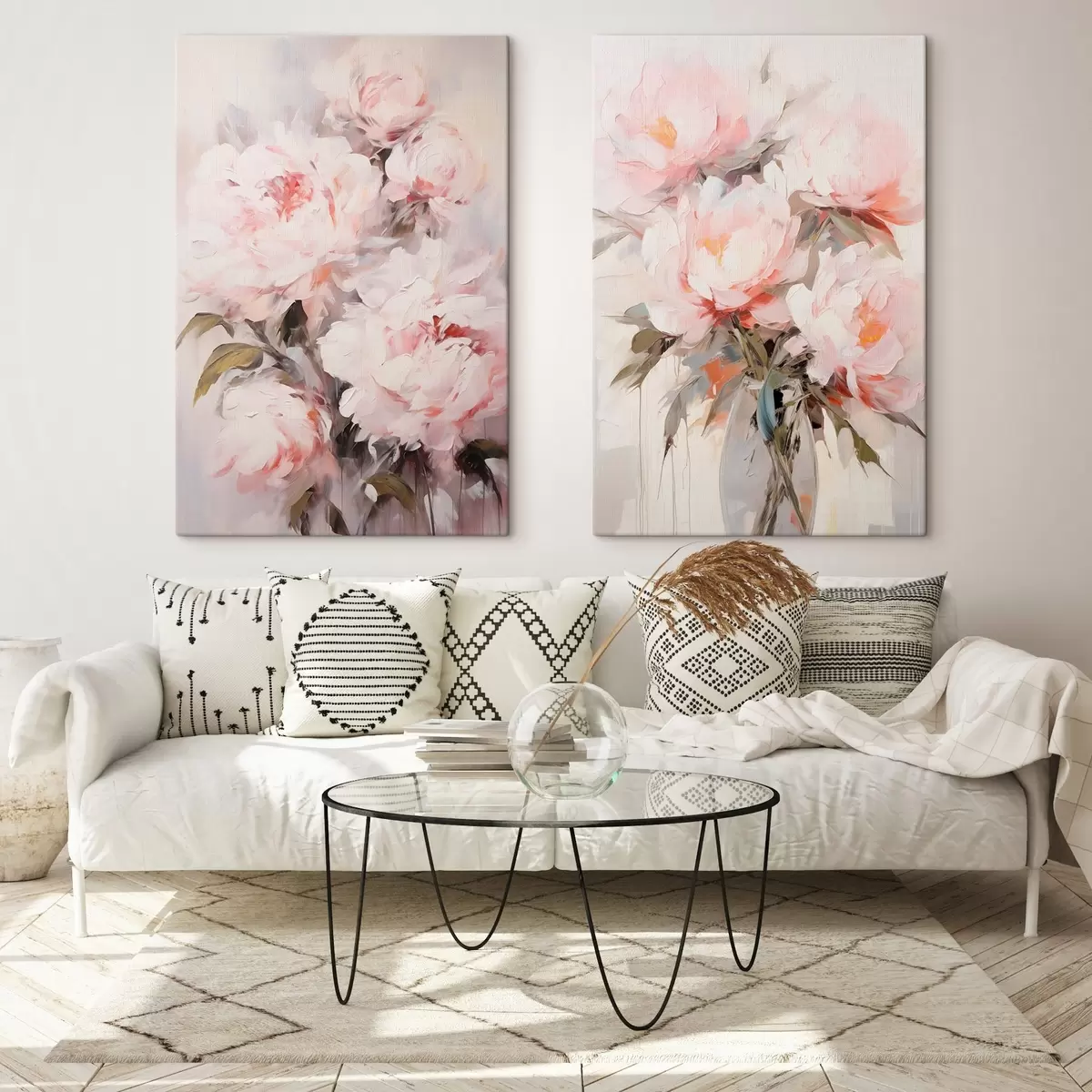 Maalid Hele roosa peonite kimp roheliste lehtedega, pehmed pintslitõmbed, pastellvärvid, hele taust Nr m00890