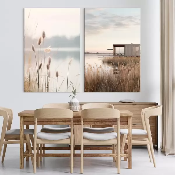 Maalid Pehmed pilliroogud rahuliku järve ääres ja kaasaegne majake kaldal Nr m00970