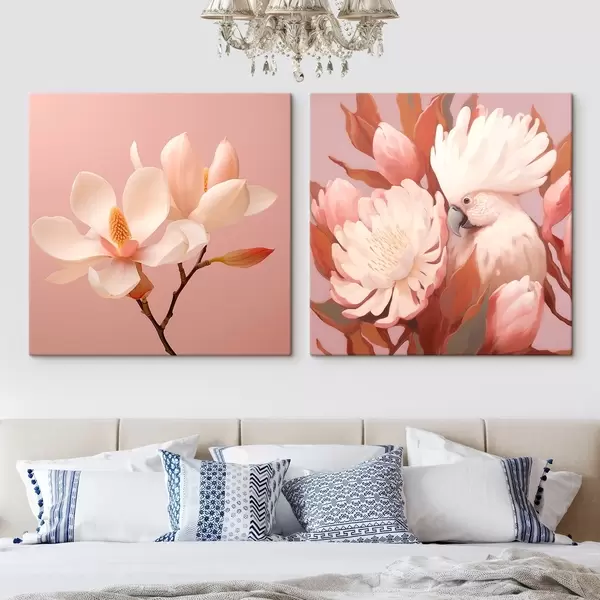 Maalid Kunstilise illustratsioonistiilis lillekompositsioon linnuga Nr m00994