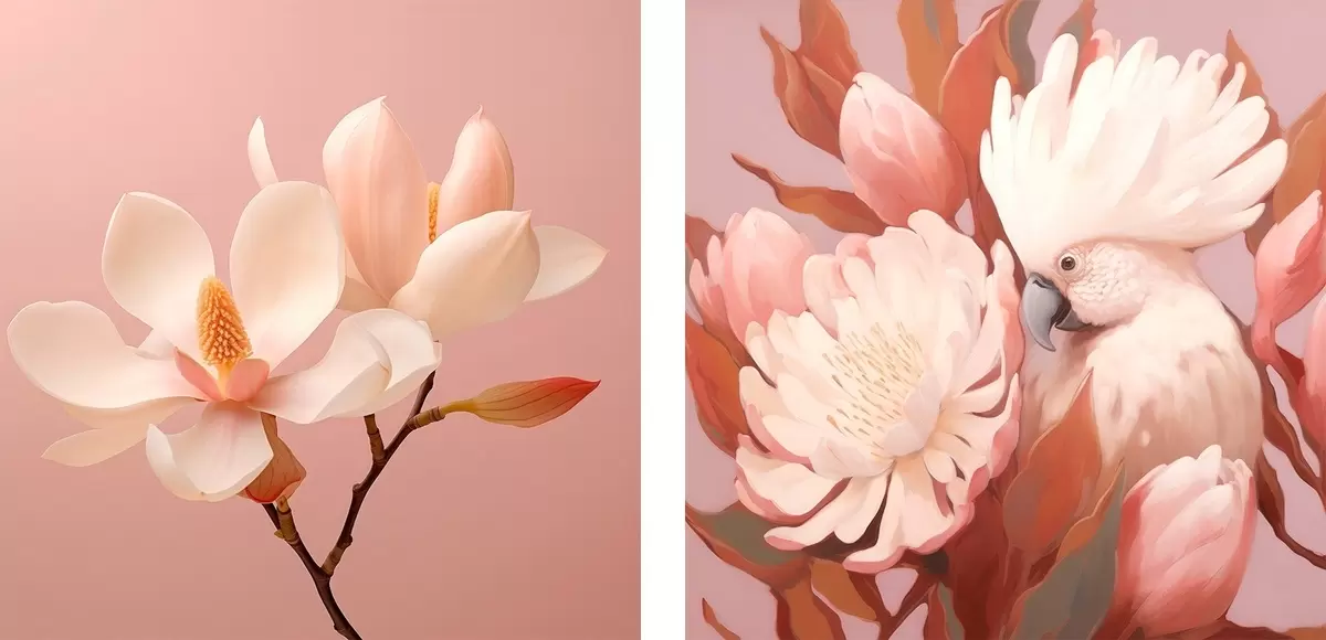 Maalid Kunstilise illustratsioonistiilis lillekompositsioon linnuga Nr m00994