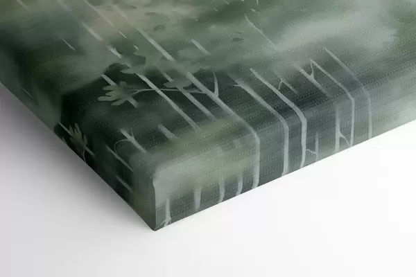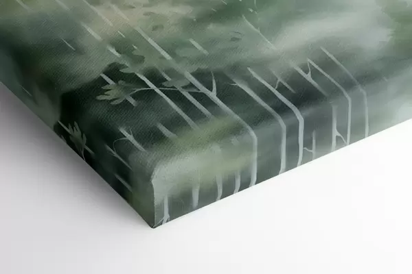 Maalid Akvarellmaal, mis kujutab abstraktset metsa kõrgetega puude ja rohelise lehestikuga, pehmed, summutatud värvid Nr m01005