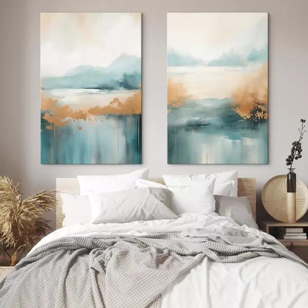 Maalid Abstraktne maastik mägedega ja järvega sinakasrohelises ja tekstuurse kollases toonis, pehmed pintslitõmbed, minimalistlik kunstiteos Nr m01012