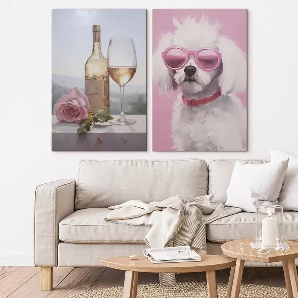 Maalid Pudel ja klaas veini ning prillidega puudel, imitatsioonmaal Nr m01021
