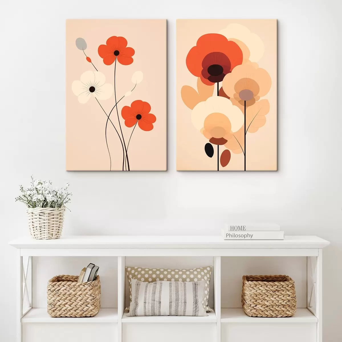 Maalid Minimalistlik lilleline diptühhon soojades beež-korallitoonides graafiliste joontega Nr m01090
