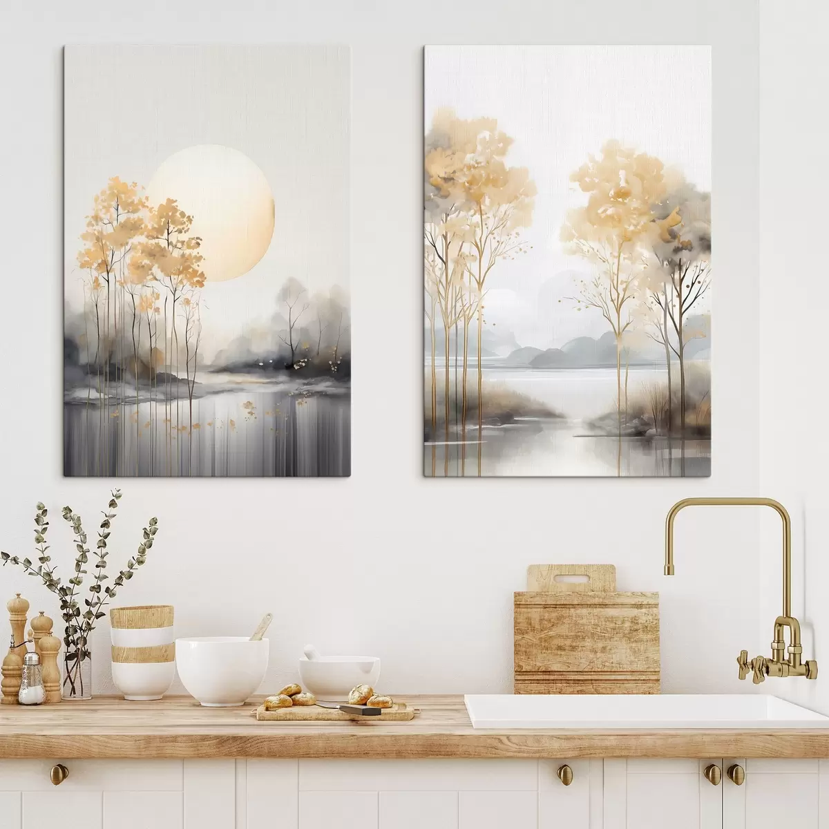 Maalid Dekoratiivne abstraktne maastik, kõrged puud kollaste lehtedega, jõgi ja udu taustal Nr m01115