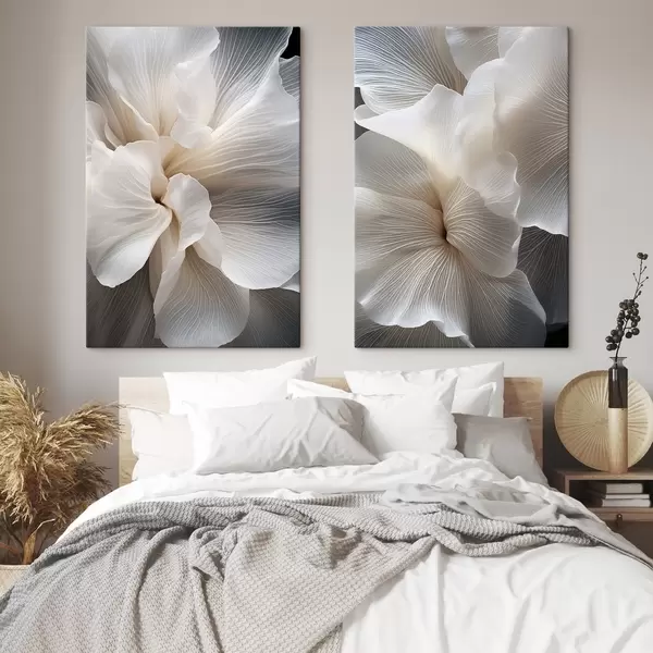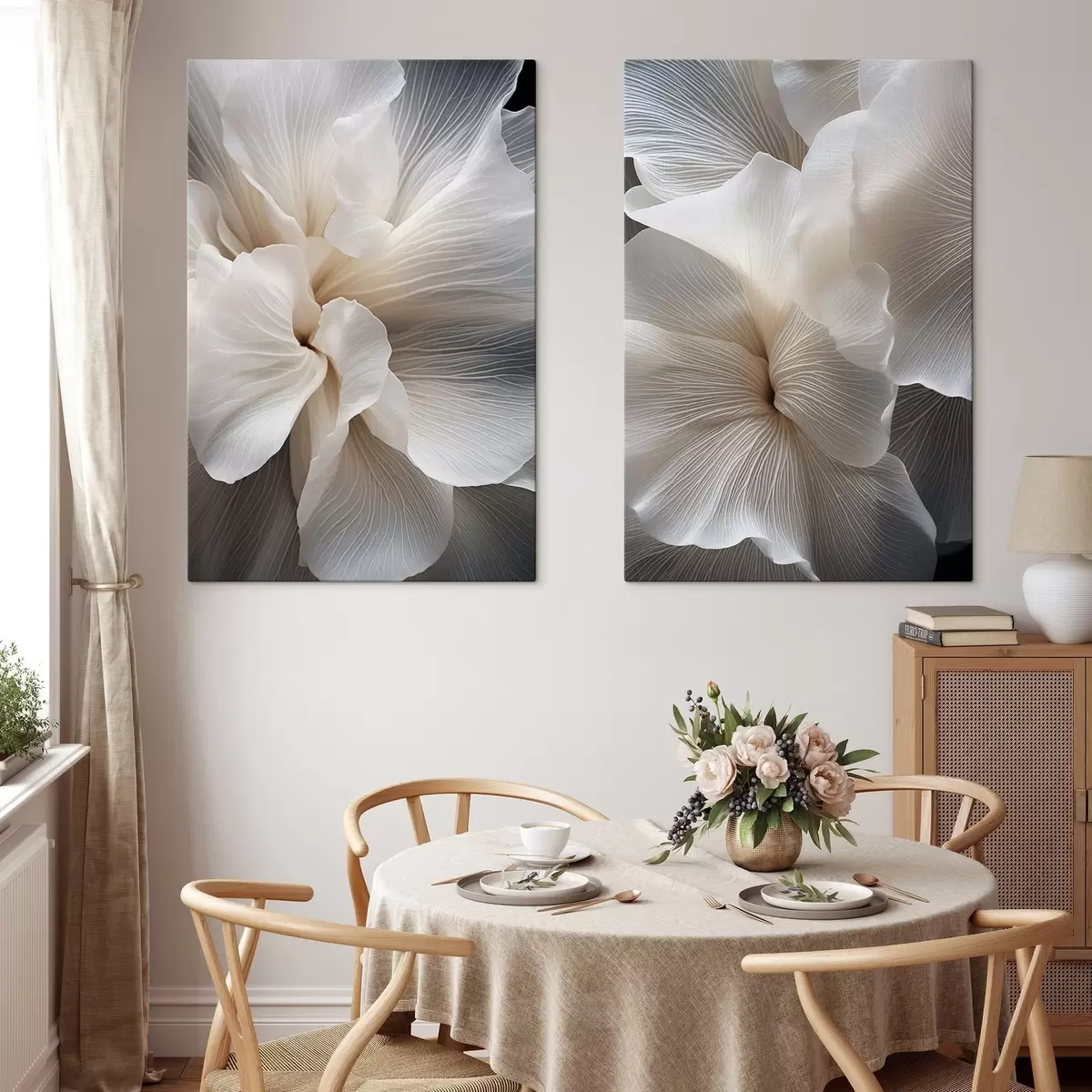 Maalid Lähedalt võetud foto õrnade abstraktsete valgetest õielehtedest, millel on keerulised jooned ja ähmane tume taust. Nr m01117
