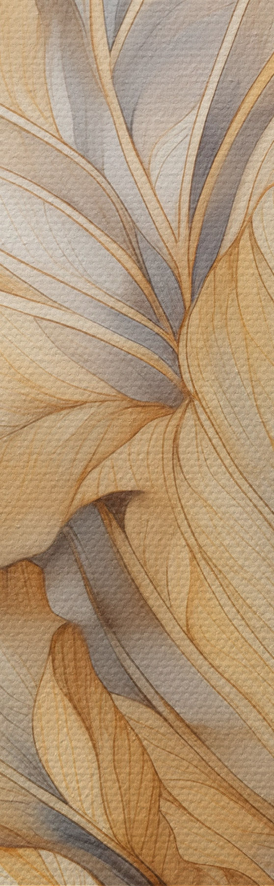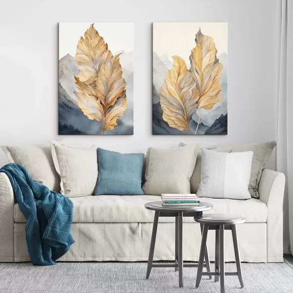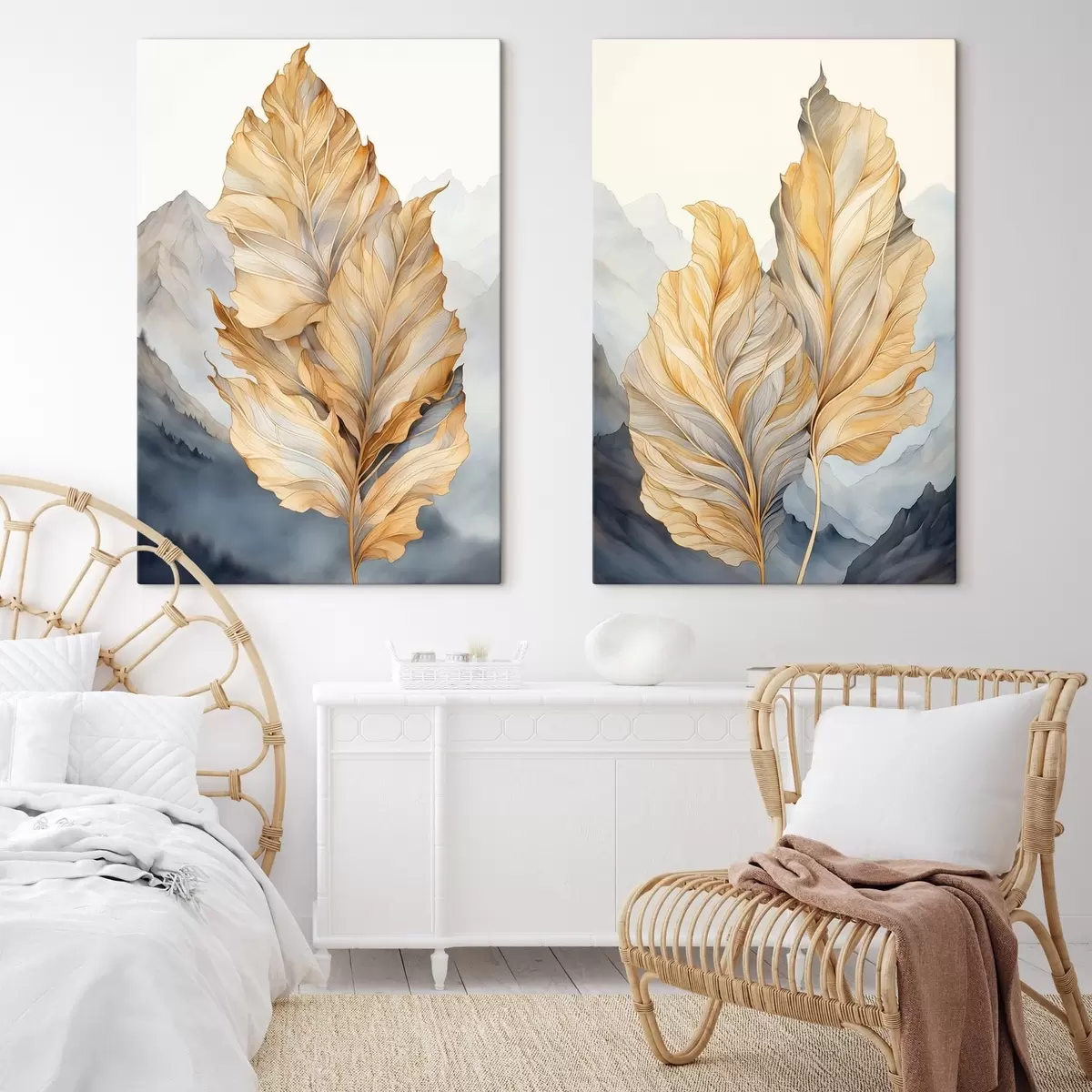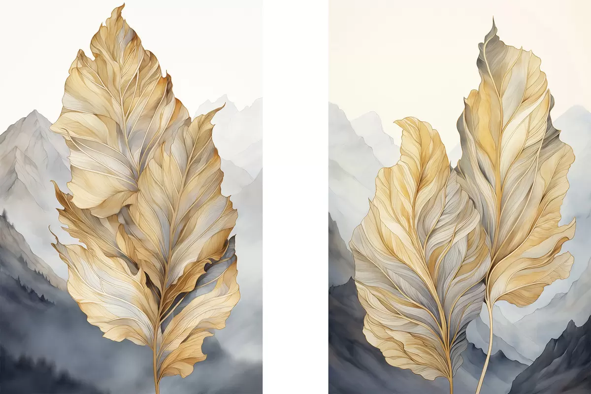 Maalid Abstraktsed suured, kollased ja pruunid lehed keeruliste detailidega, mäestiku taustal Nr m01119