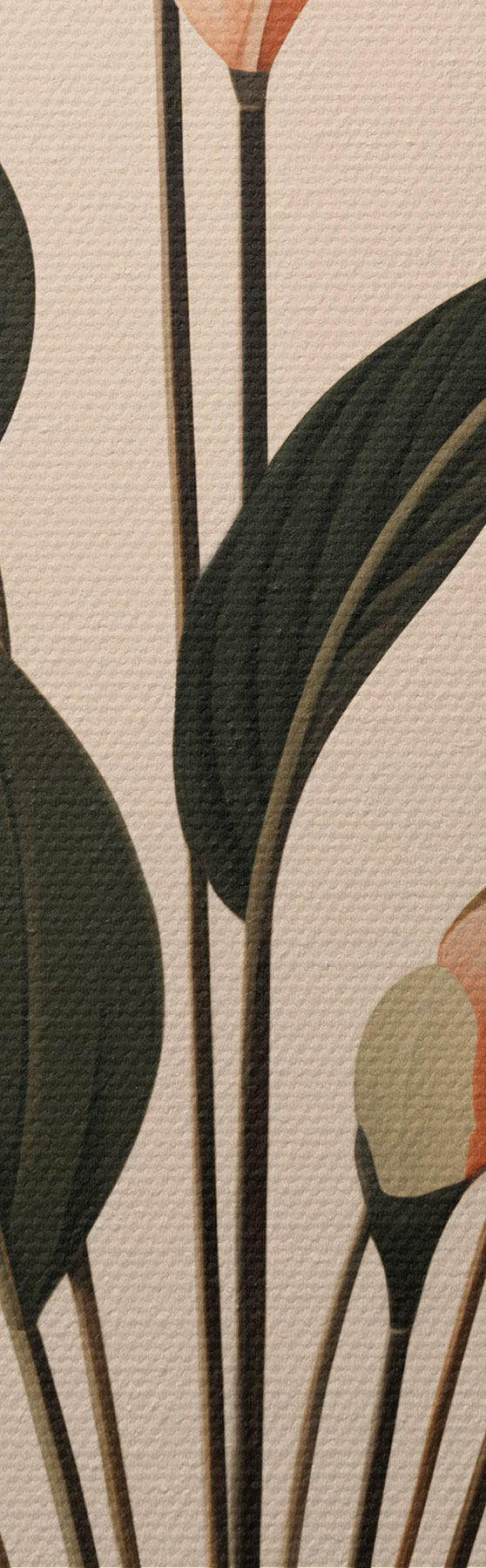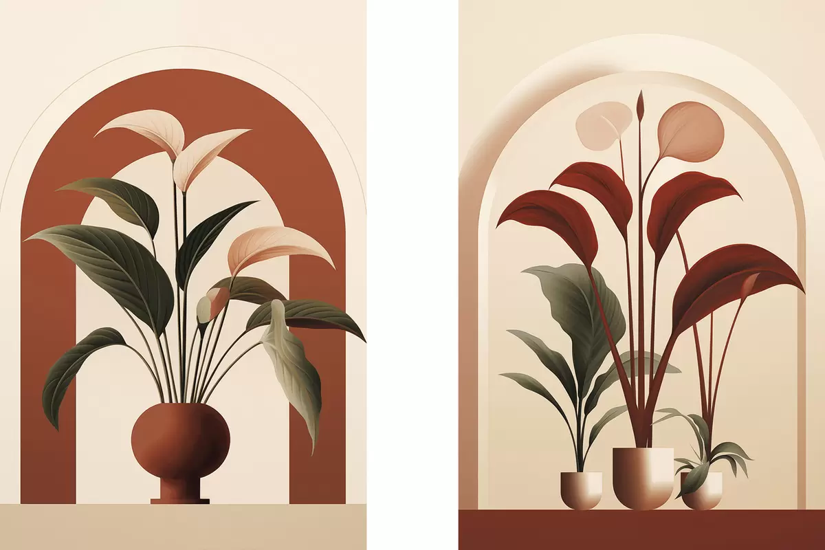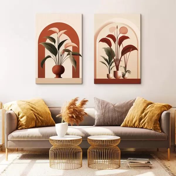 Maalid Abstraktsed potitaimed suurte roheliste ja punaste lehtedega kreemika värvi kaariku ees Nr m01124