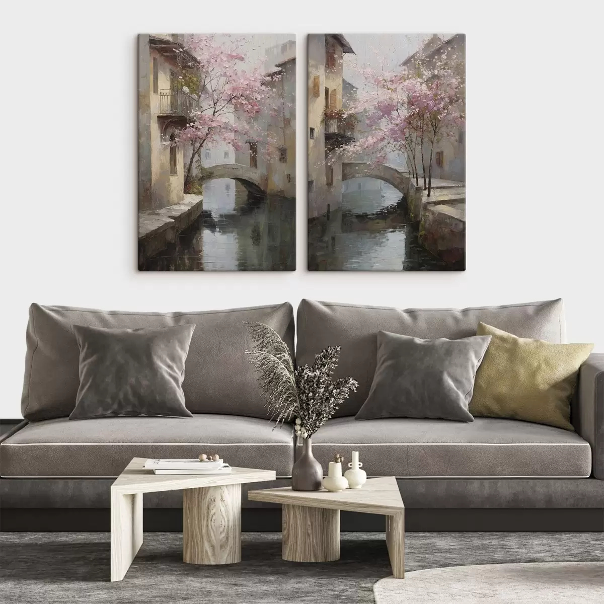 Maalid romantiline linnamaastik õitsva puuga õlimaalistiilis Nr m01173