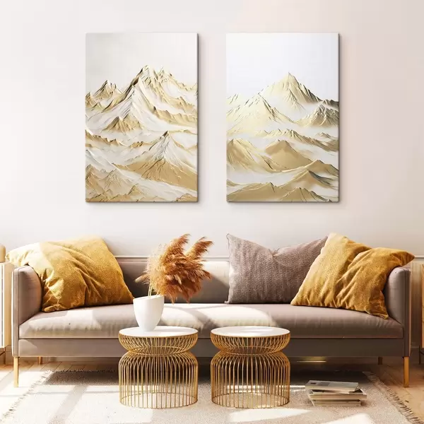 Maalid Kollane maastik, lumiste mäetippude ja sügavate orgudega heleda taeva all Nr m01236