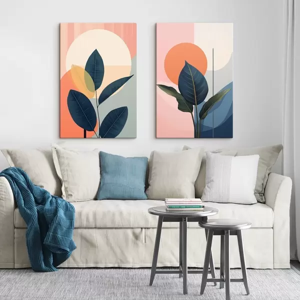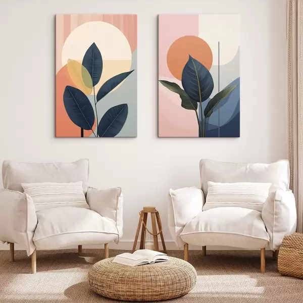 Maalid Tumedad lehed abstraktsete kujundite taustal virsiku- ja halli värvitoonides, millel on suur kahvatukollane ring. Nr m01238