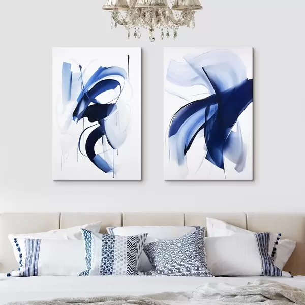 Maalid Abstraktsed sinised pintslitõmbe-taolised kujundid voolavate joonte ja kõverustega valgel taustal, modernne kunst Nr m01240