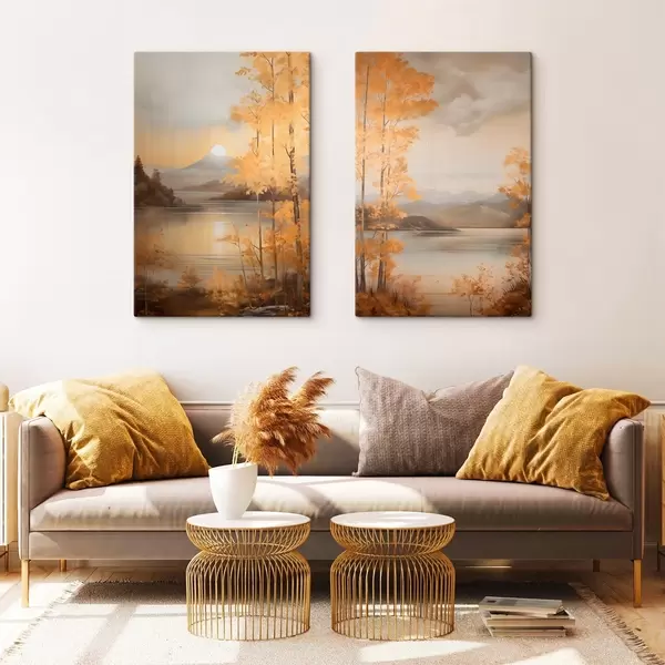 Maalid Sügisene tekstuuriga puud oranžide lehtedega raamivad rahulikku järve kauguses asuvate mägedega pilvise taeva all. Nr m01246