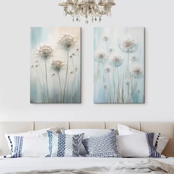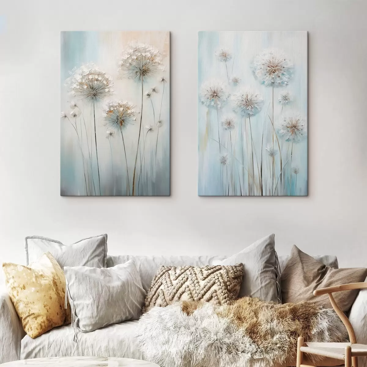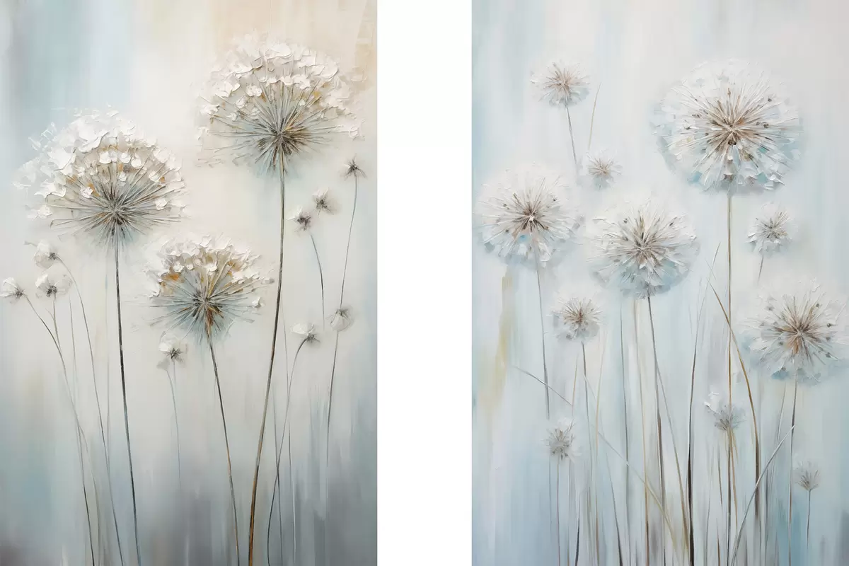 Maalid Tekstuuriga maalistiil, millel on kujutatud võililled pehme sinise ja valge taustaga Nr m30048