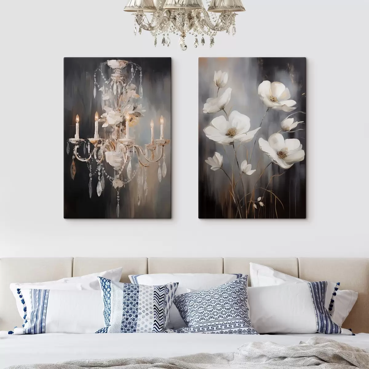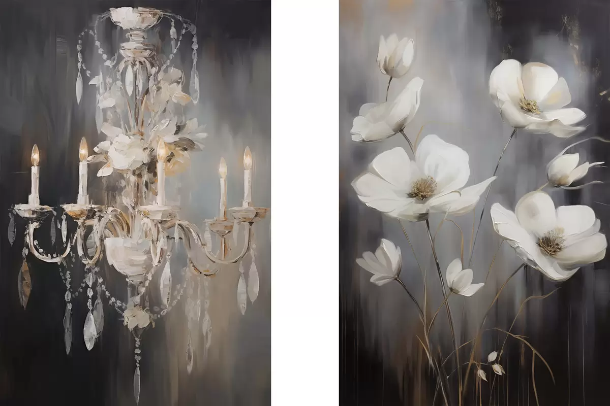 Maalid Abstraktne kaunistatud lühter süüdatud küünaldega ja lillekunstiga tumedal, tekstuurse taustaga Nr m30049