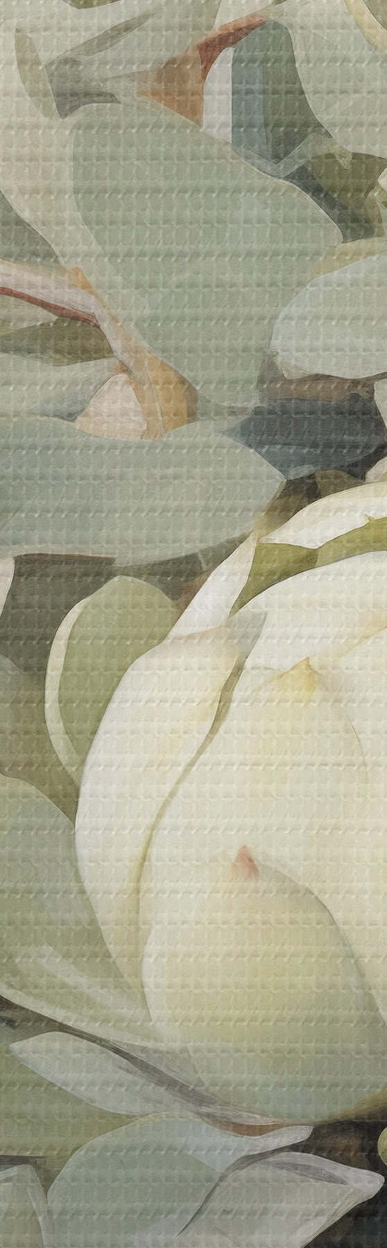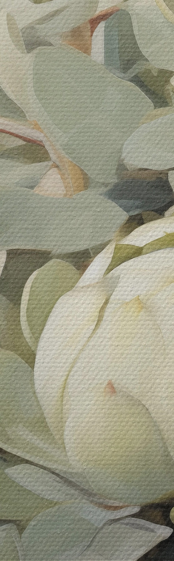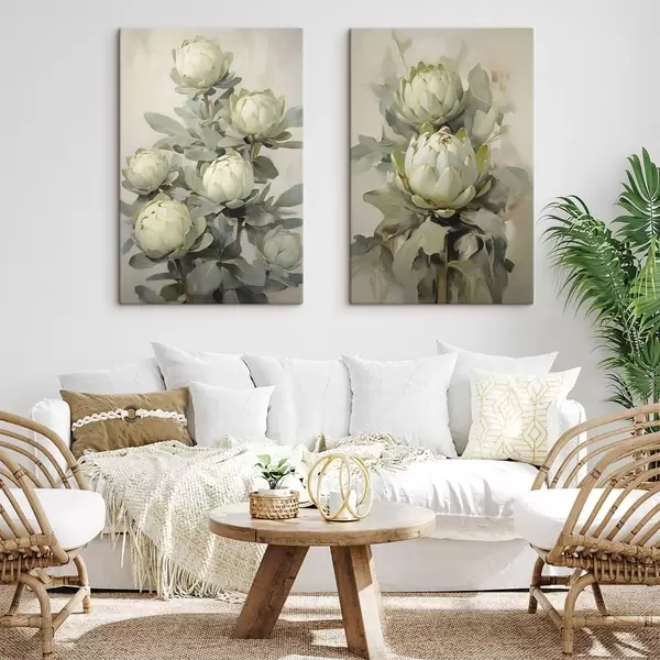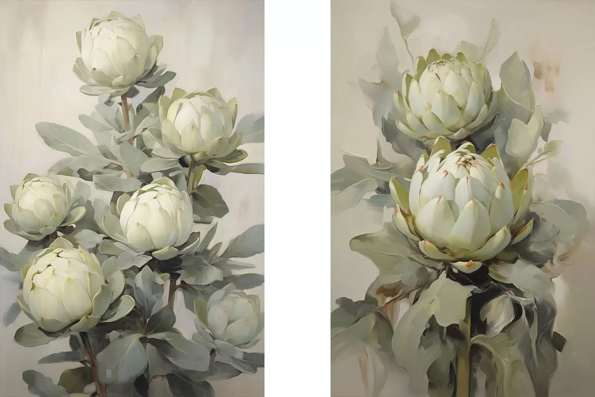 Maalid Maalistiil, milles on kujutatud mitu valget protea-lille suurete roheliste lehtedega heledal taustal. Nr m30051