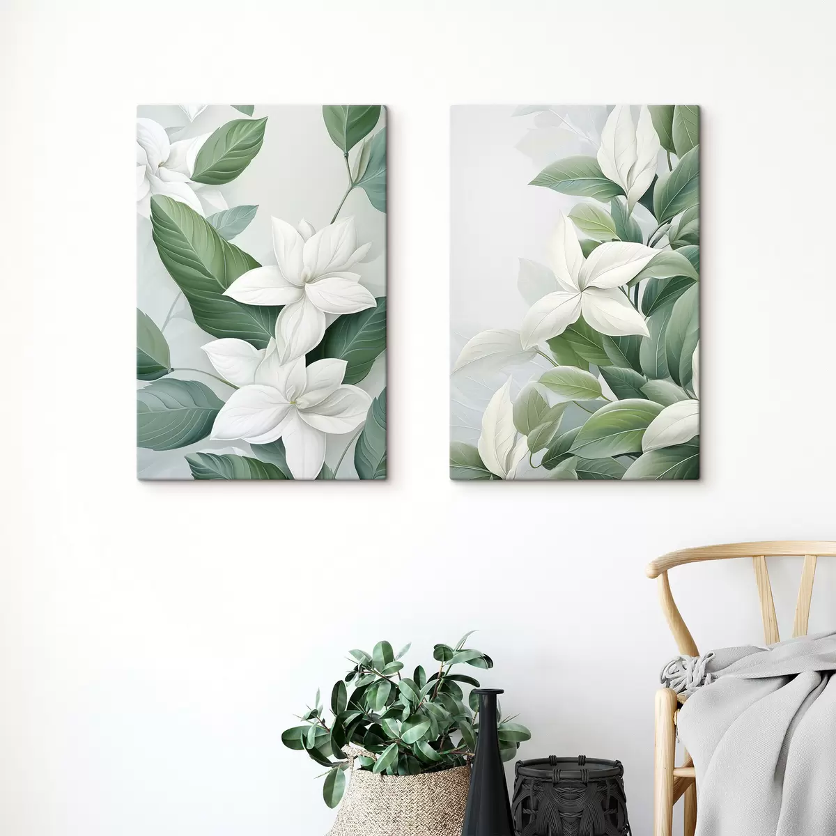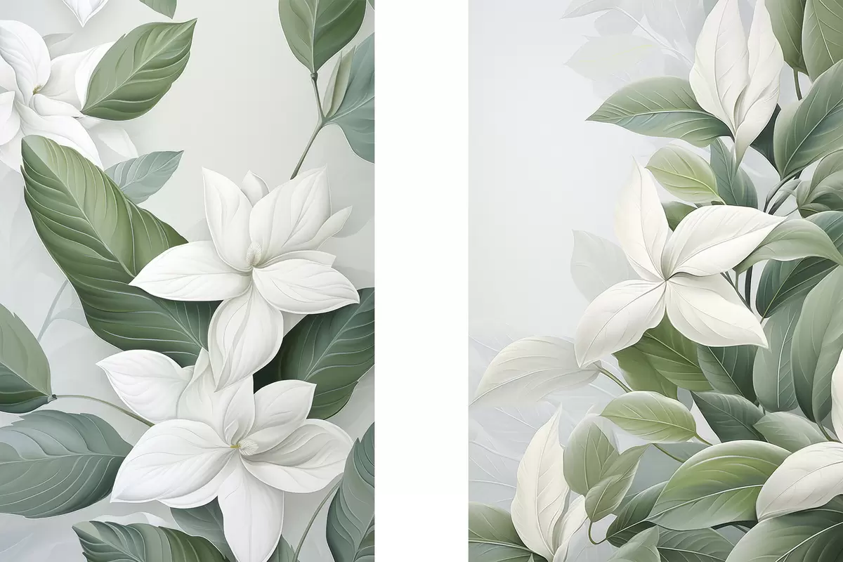 Maalid Valged lilled roheliste lehtedega, pastellne taust Nr m30055