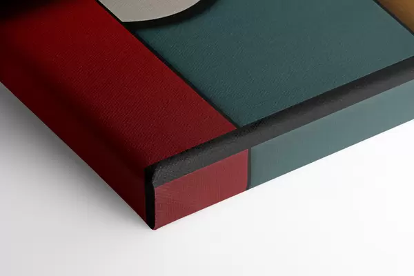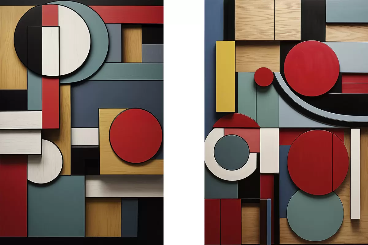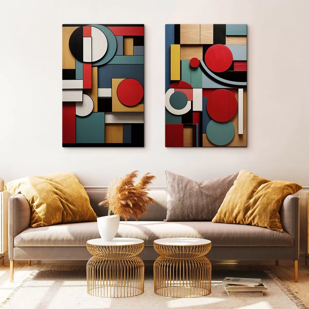 Maalid Abstraktne geomeetriline kompositsioon puidu tekstuuri imitatsiooniga, punased, mustad, valged ja sinakasrohelised ristkülikud ja ringid Nr m30058