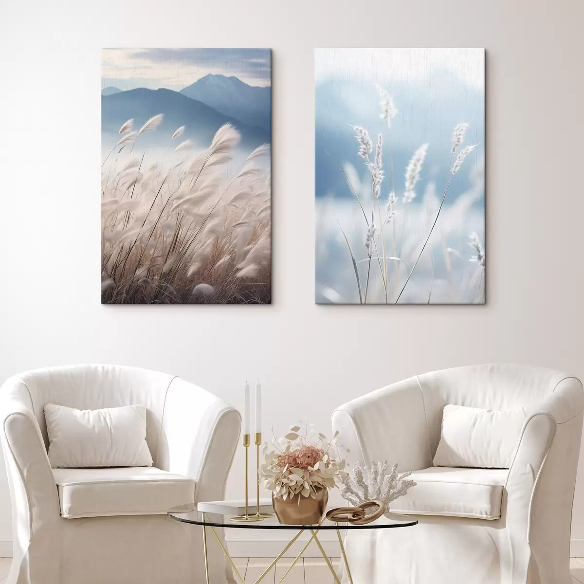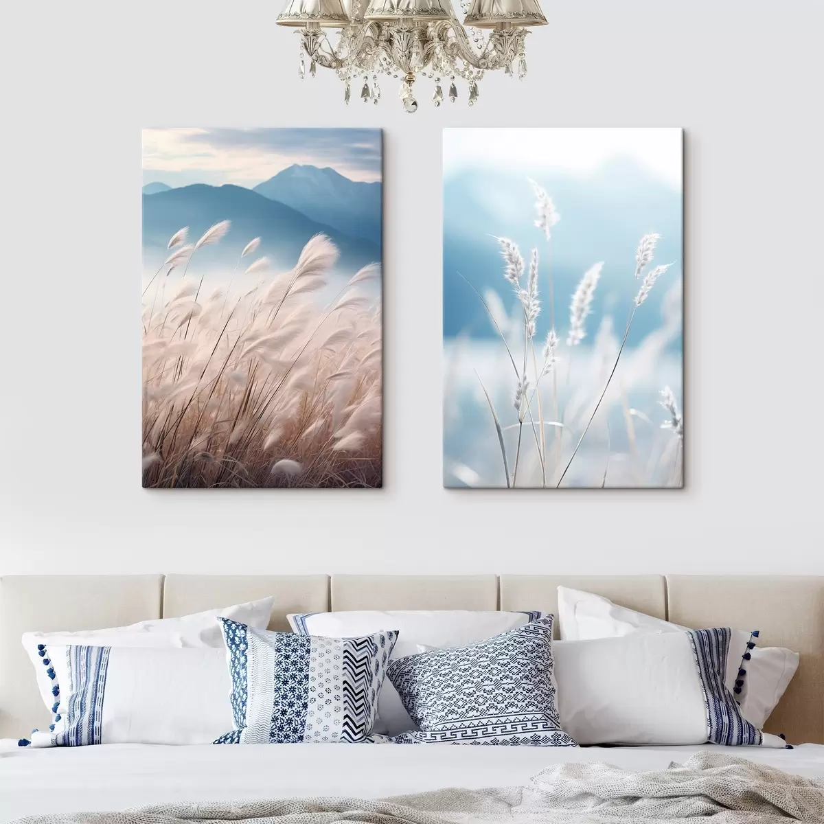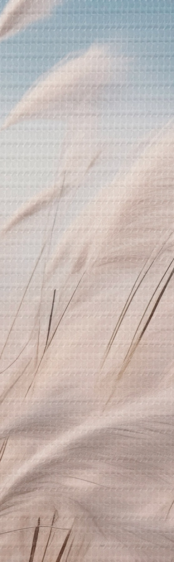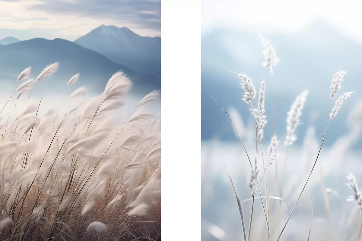 Maalid Pikk, valge pampasrohi tuules lehvimas, taustal pehmed sinised mäed Nr m30060