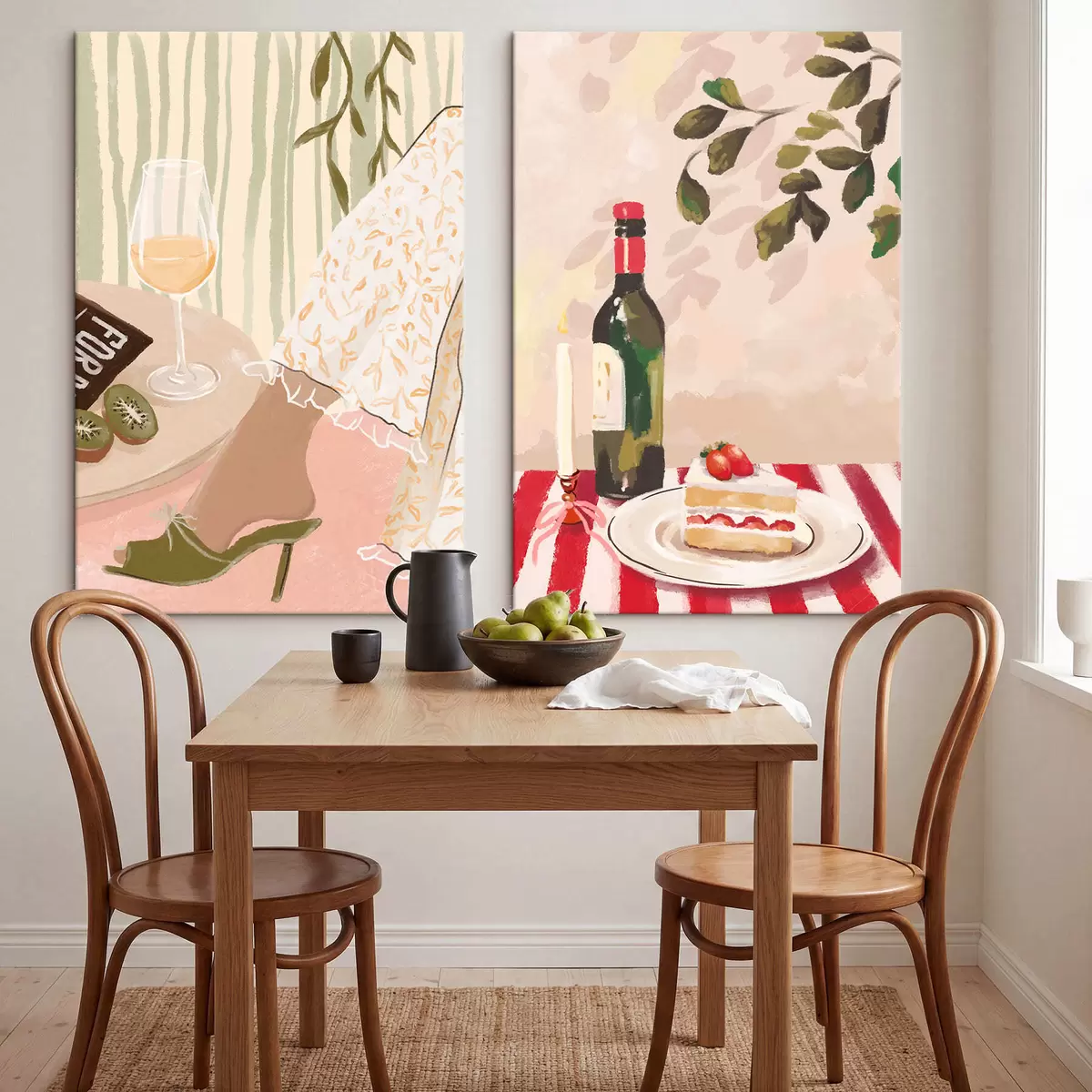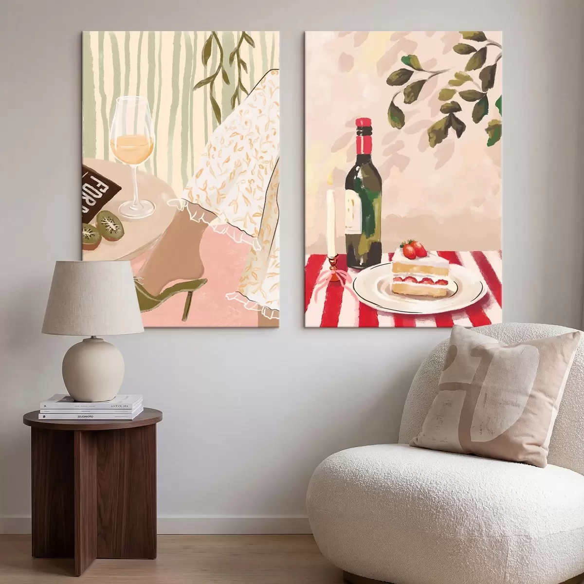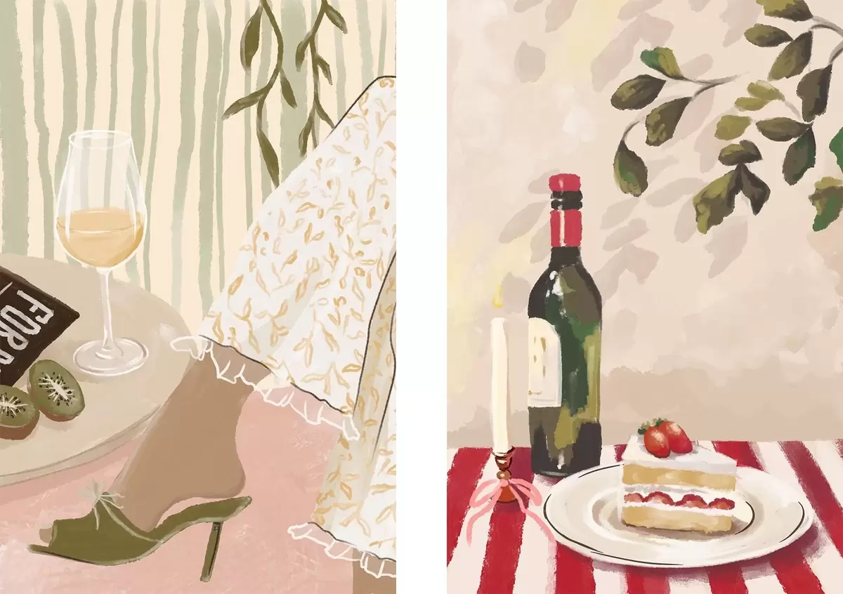 Maalid Veini klaas, pudel ja kook laual Nr m30105