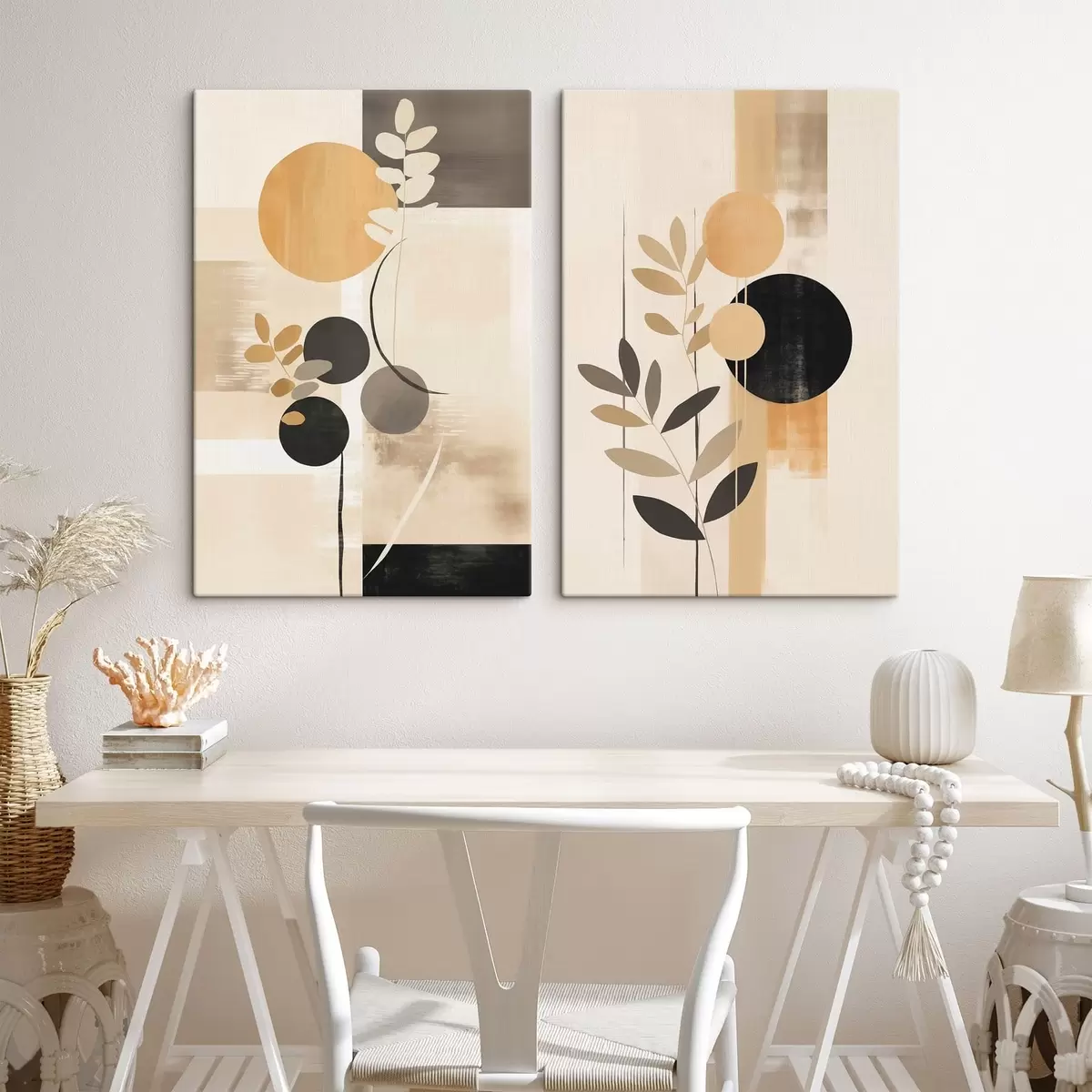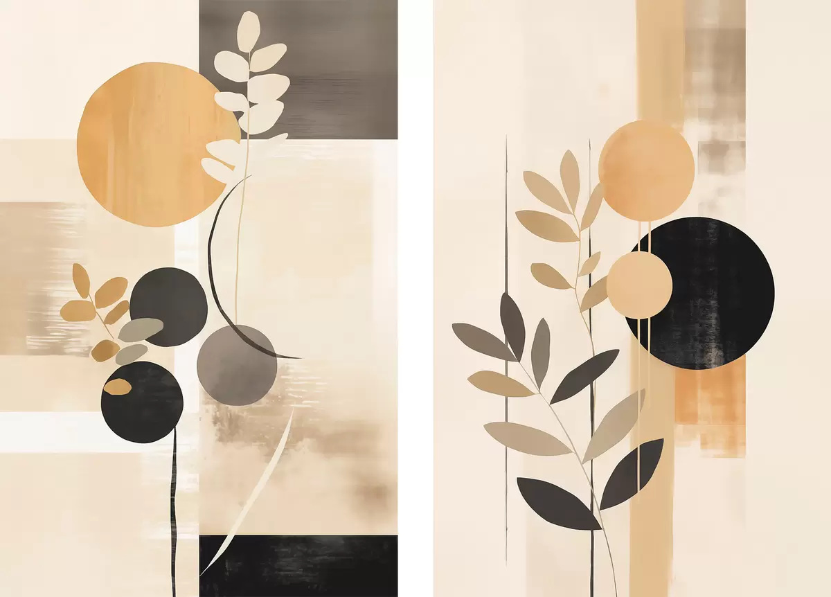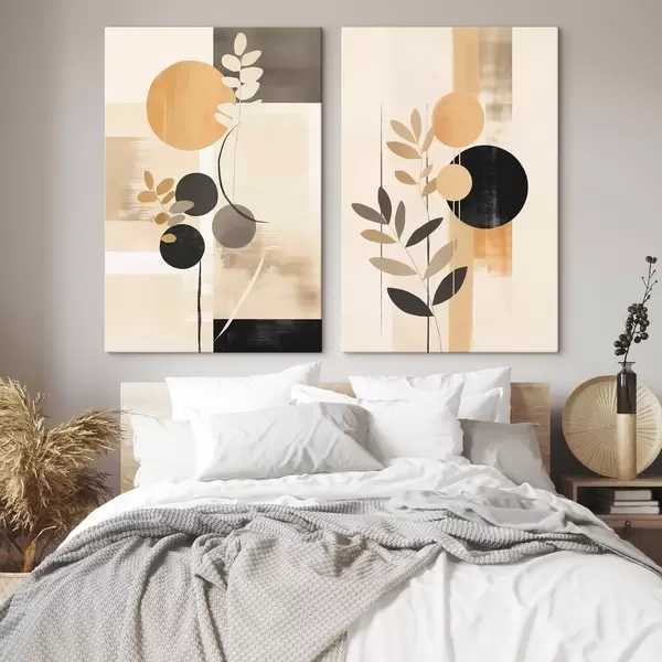 Maalid Lehtede ja ringidega abstraktsed maalid Nr m30133