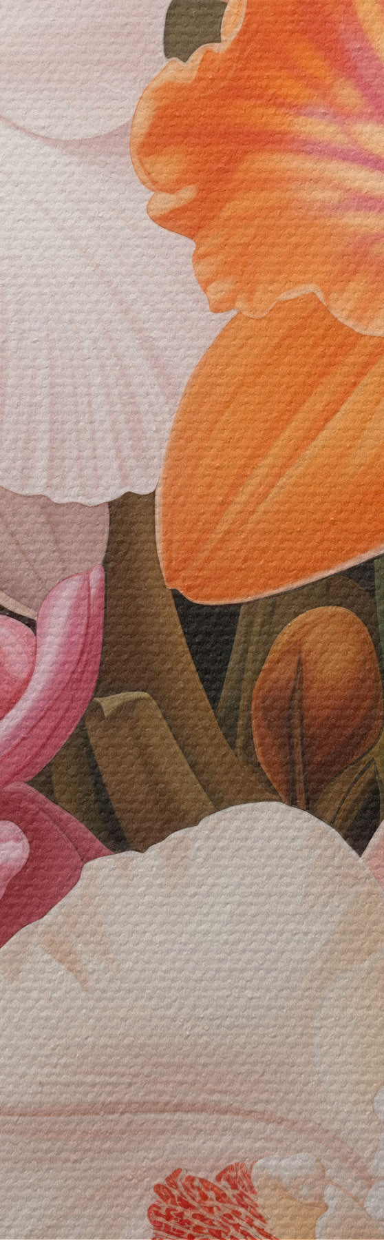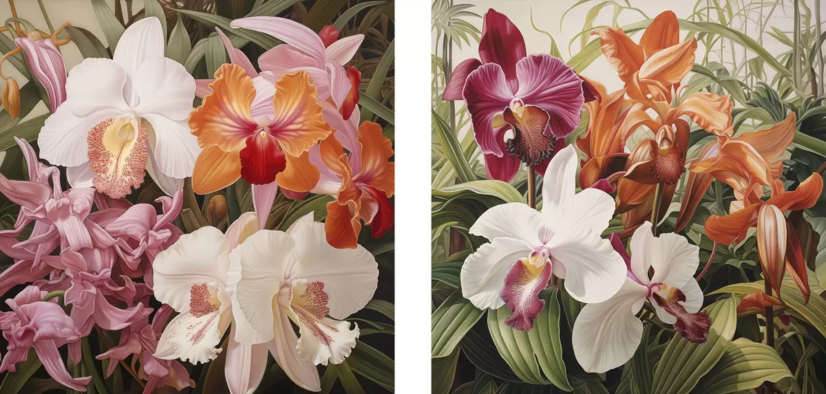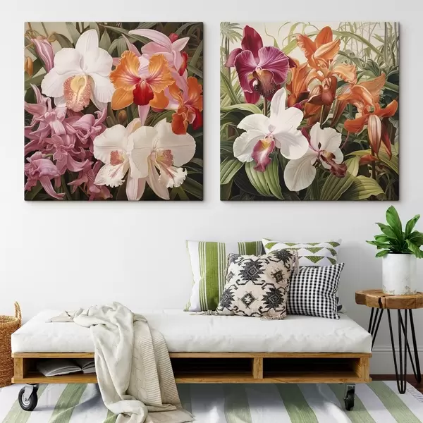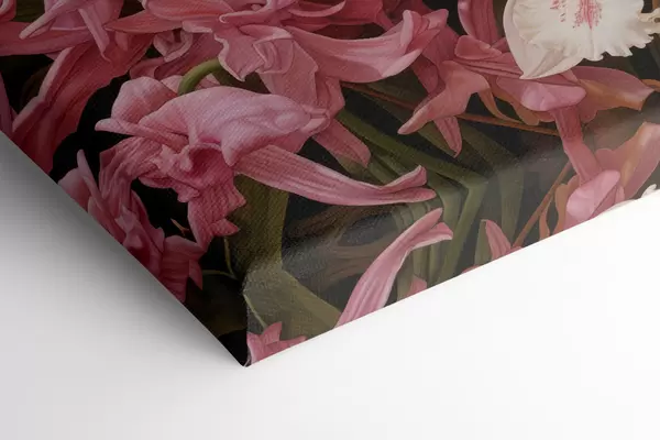 Maalid Troopiliste lillede kimp, taustal rohelise lehestikuga orhideed Nr m30197