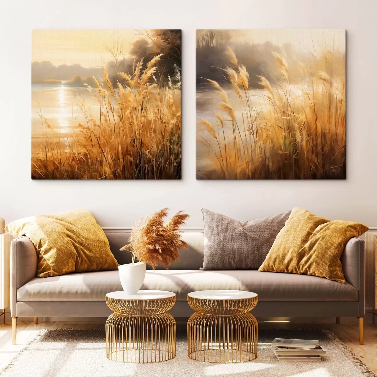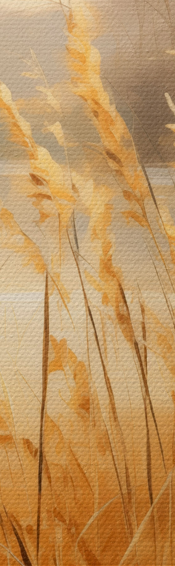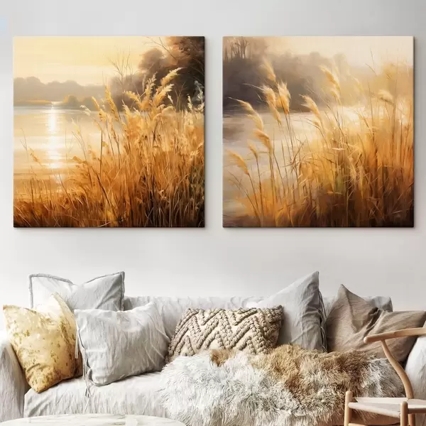 Maalid Esiplaanil kõrge, kuiv viljakobaradega rohi, tagaplaanil järv ja puud Nr m30201