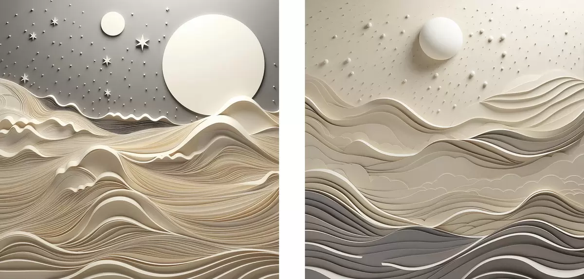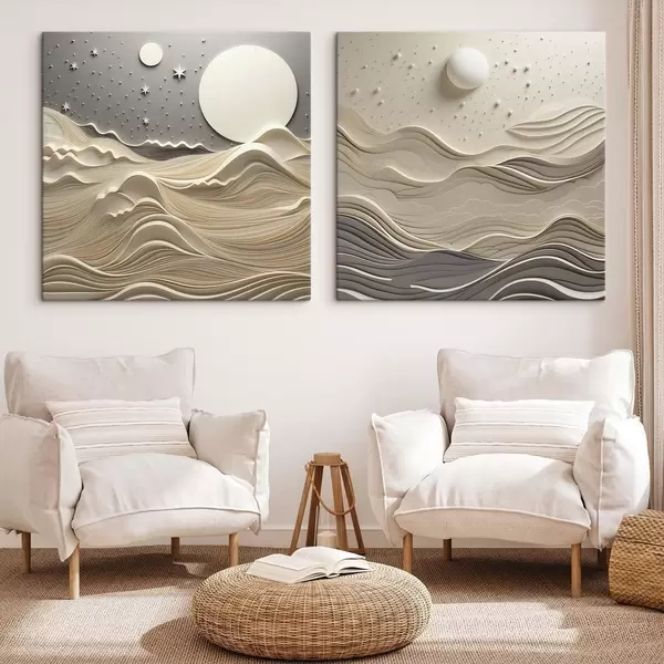 Maalid Minimalistlik stiliseeritud maastik künklike mägedega ja suure kuuga tähtede taevas, abstraktne kunst Nr m30205