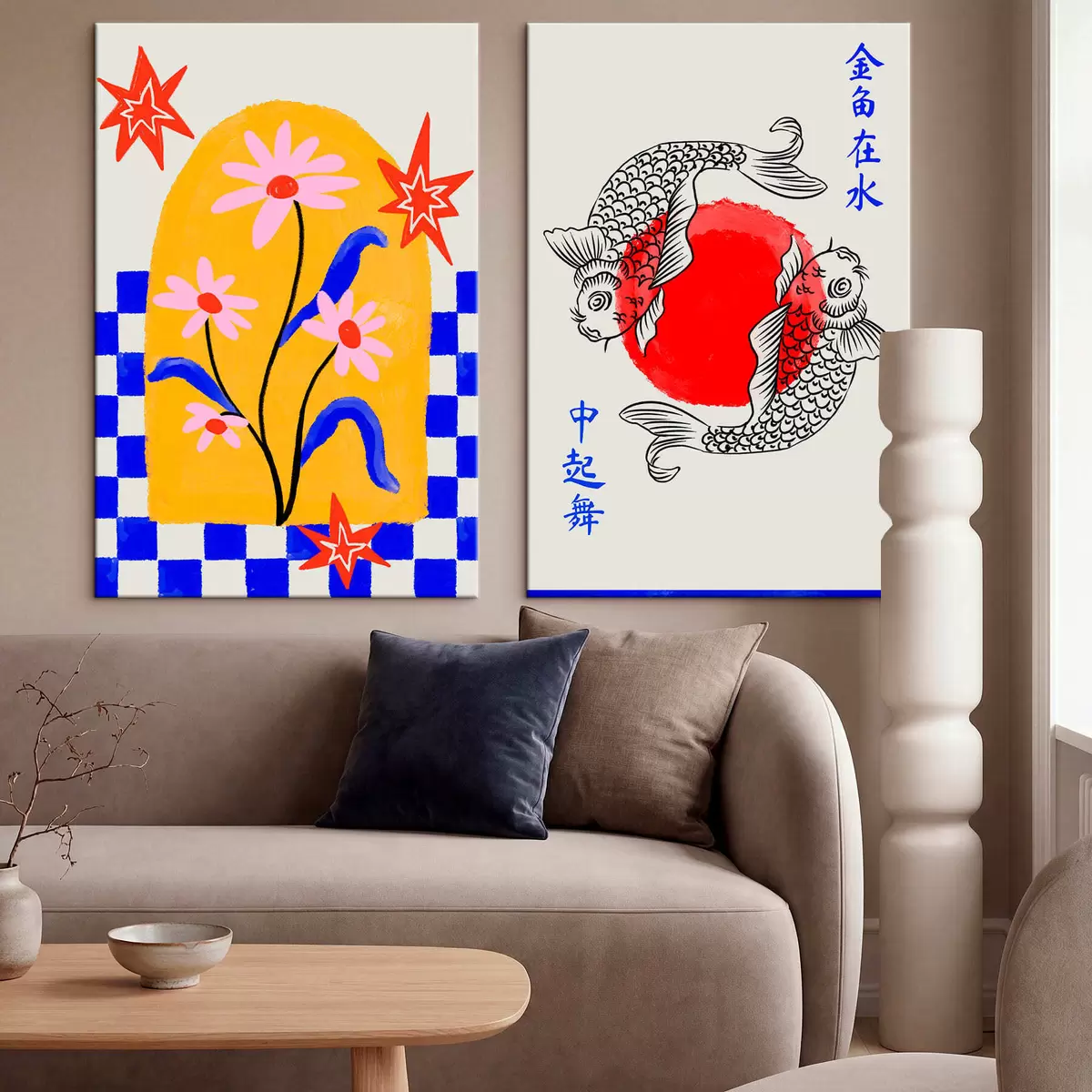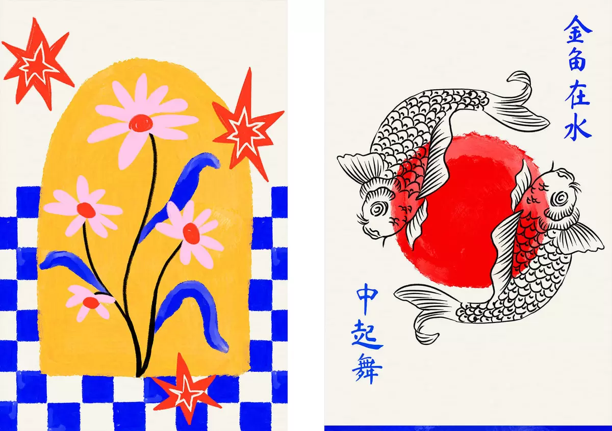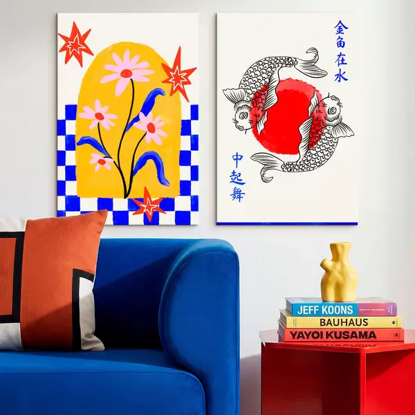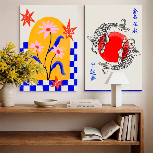 Maalid Kaheosaline maal, millel on kujutatud kass ja kaks kala punastes ja valgetes toonides Nr m30235