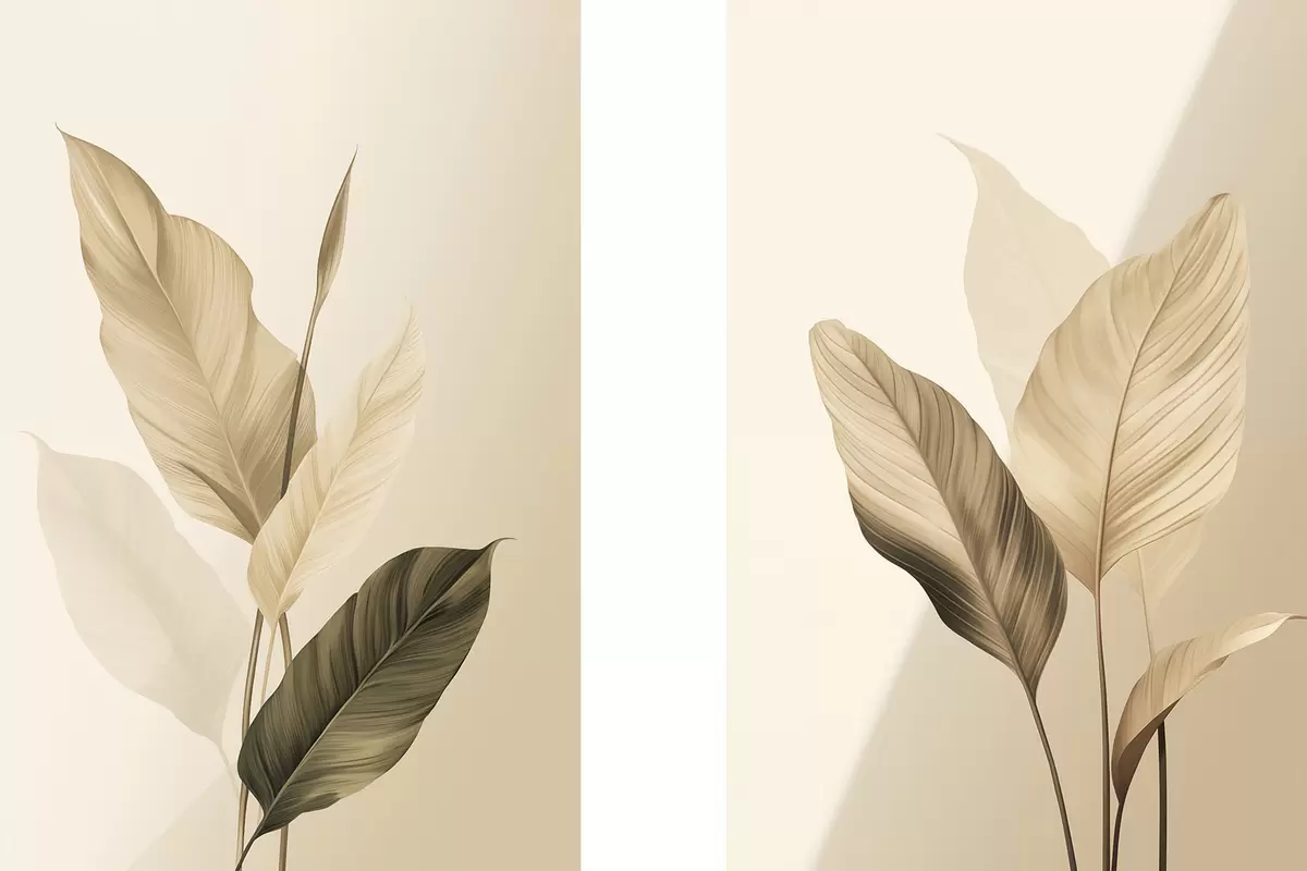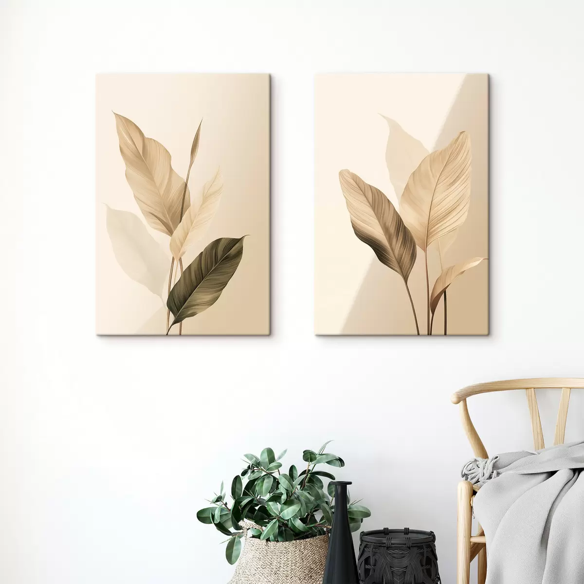 Maalid Suured troopilised lehed beeži ja pruuni toonides, hele taust Nr m30313