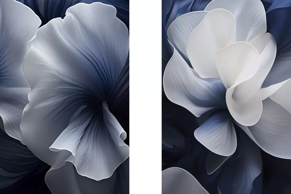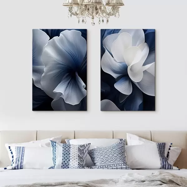 Maalid Abstraktsed sinised ja valged õielehed tumedal taustal Nr m30316