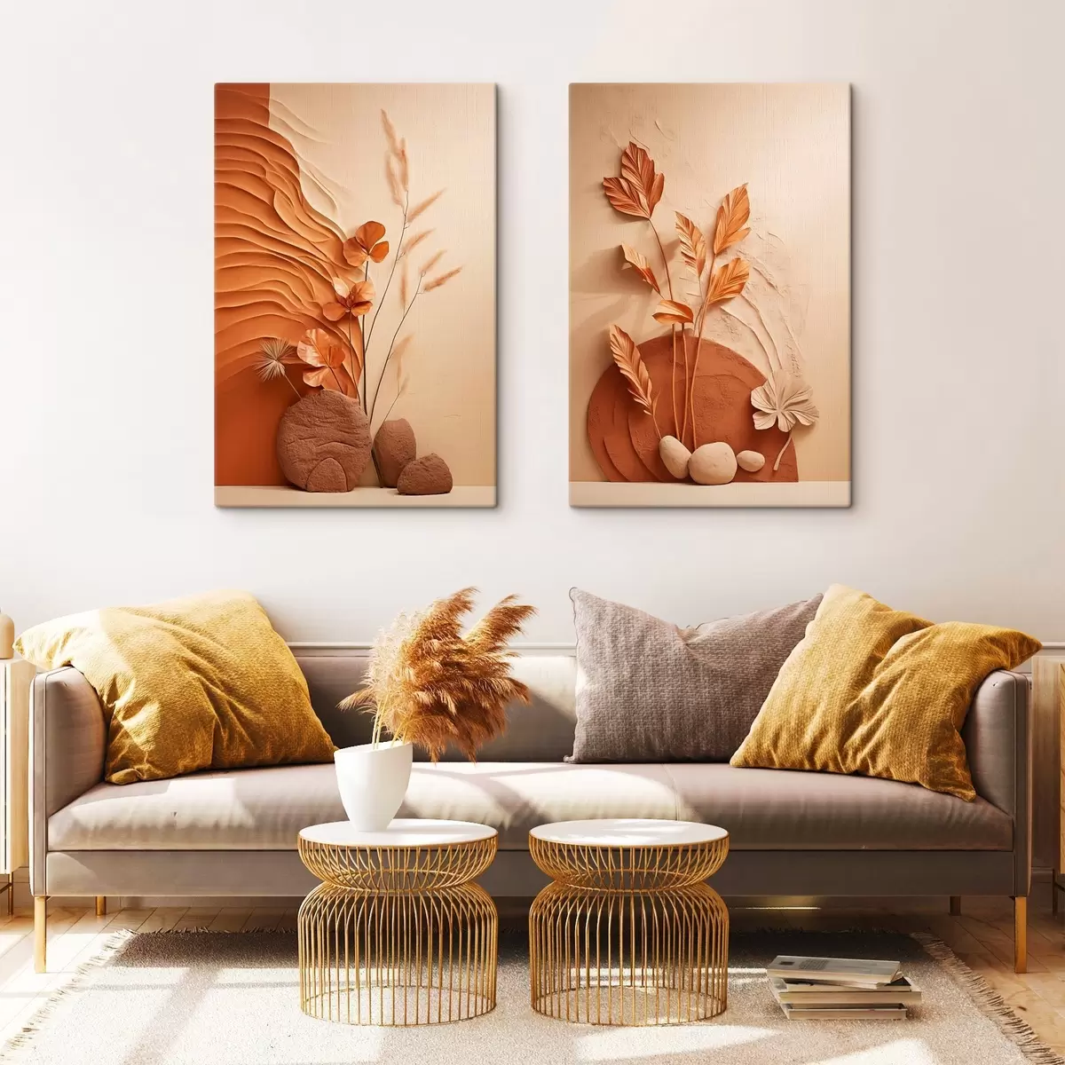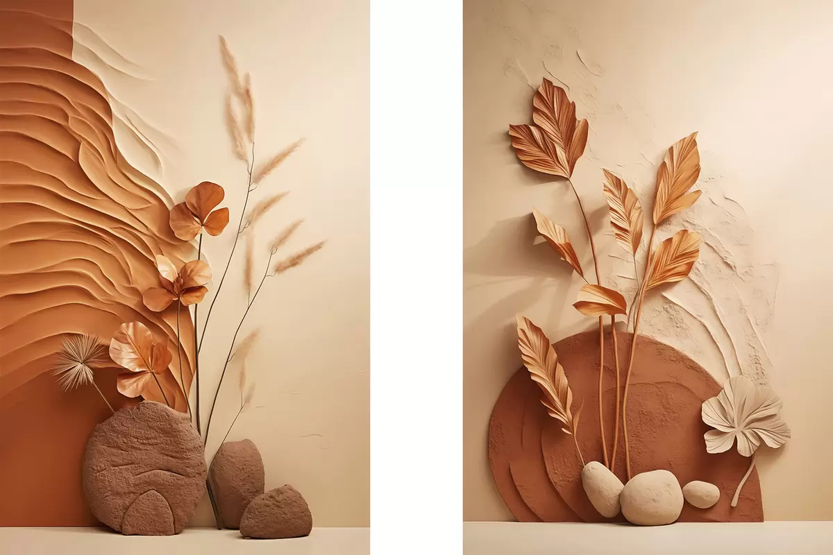 Maalid Minimalistlik kunstiteos kuivatatud lilledest ja pampasrohtudest, tekstuurse taustaga Nr m30320