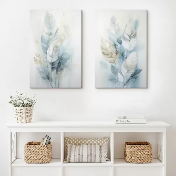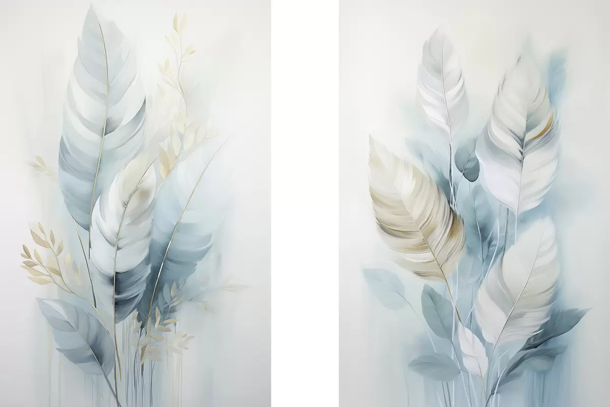 Maalid Suured, pehmed sinise ja valge tooniga suled ning õrnad beežid lehed Nr m30325