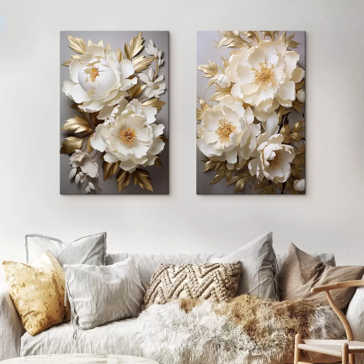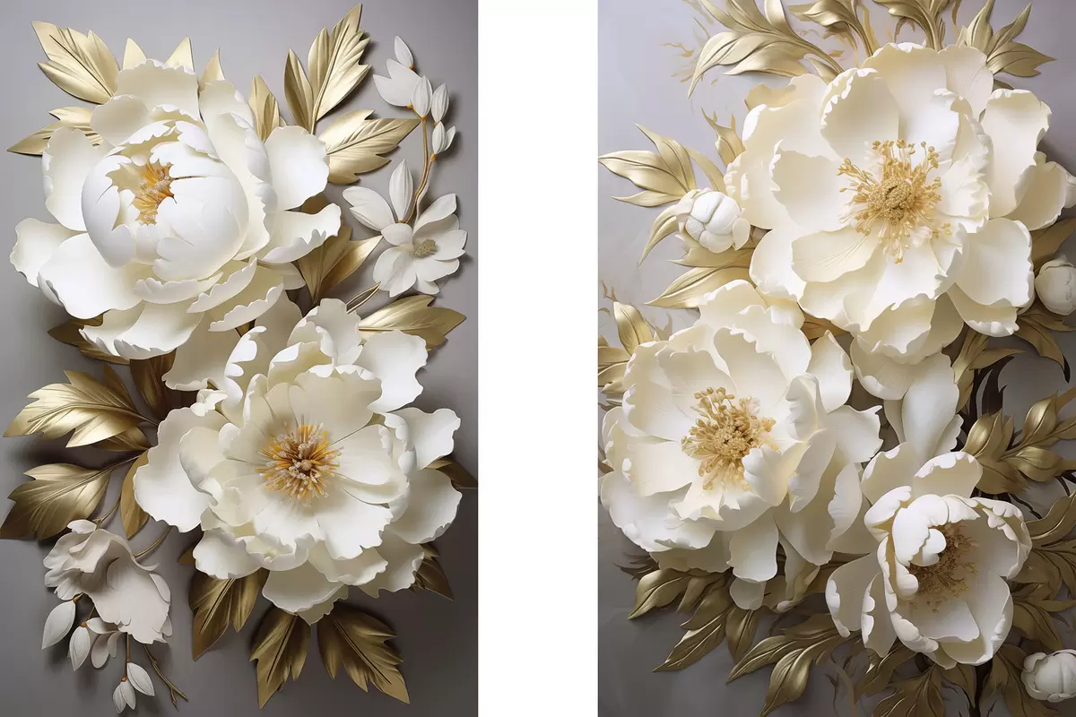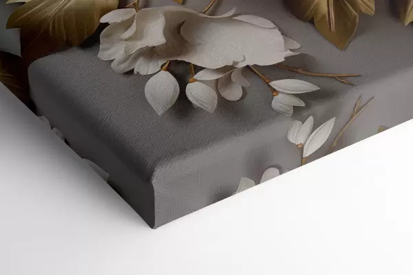 Maalid Suured valged pioonid kollaste lehtedega hallil taustal Nr m30327