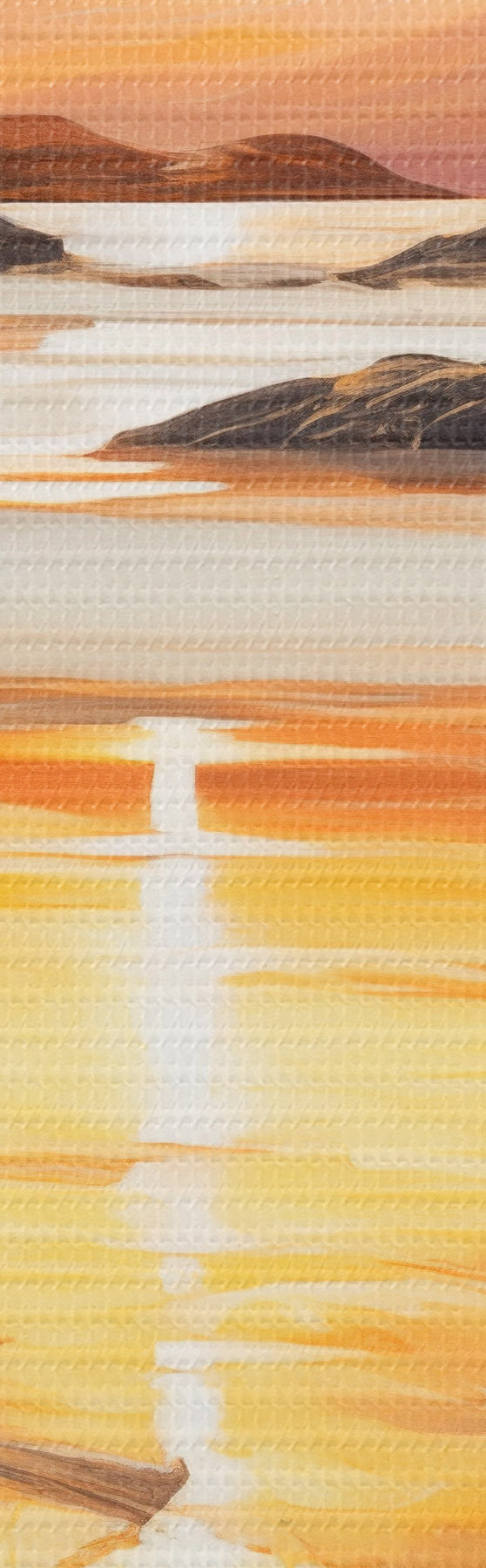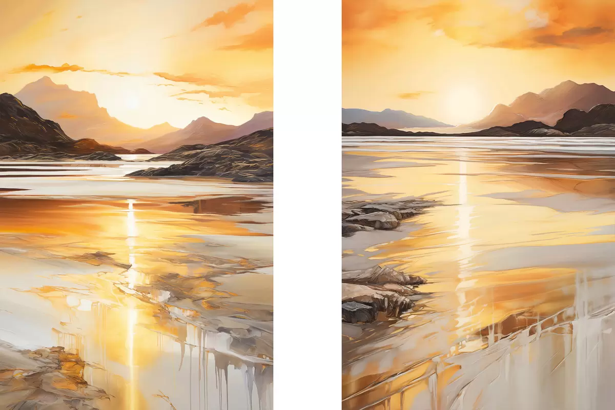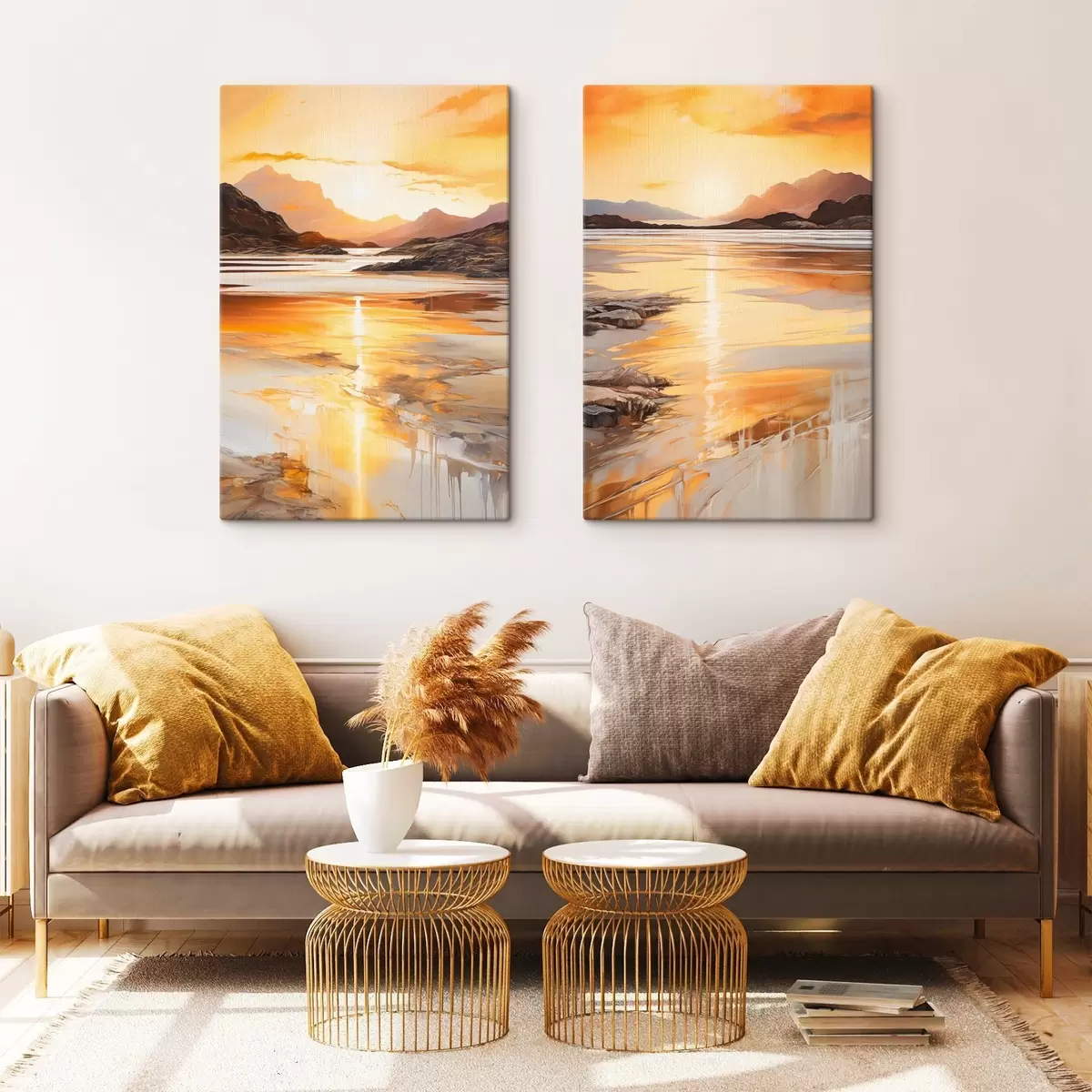 Maalid Maastik jõega ja mägedega sooja oranži taeva all, päikeseloojang Nr m30328