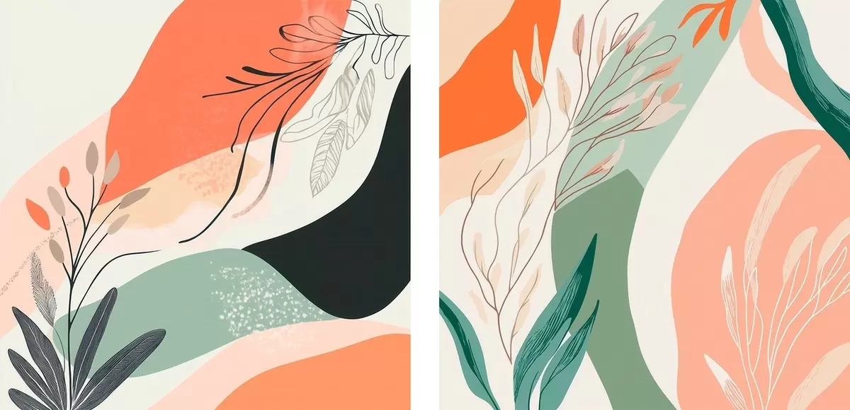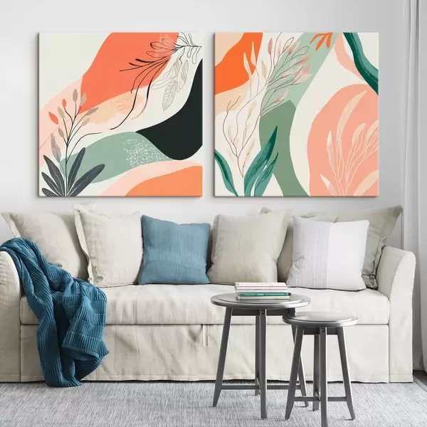 Maalid Abstraktne diptühhon taimemotiividega ja värviliste laikudega kaasaegses stiilis Nr m30347