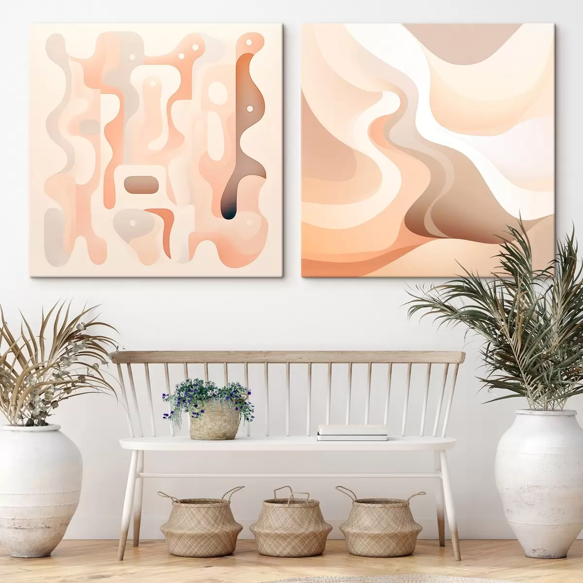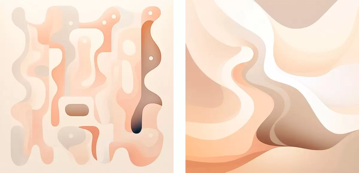 Maalid Abstraktne kompositsioon voolavate joonte ja ruumiliste vormidega beežikaspruuni värvipalettis Nr m30349